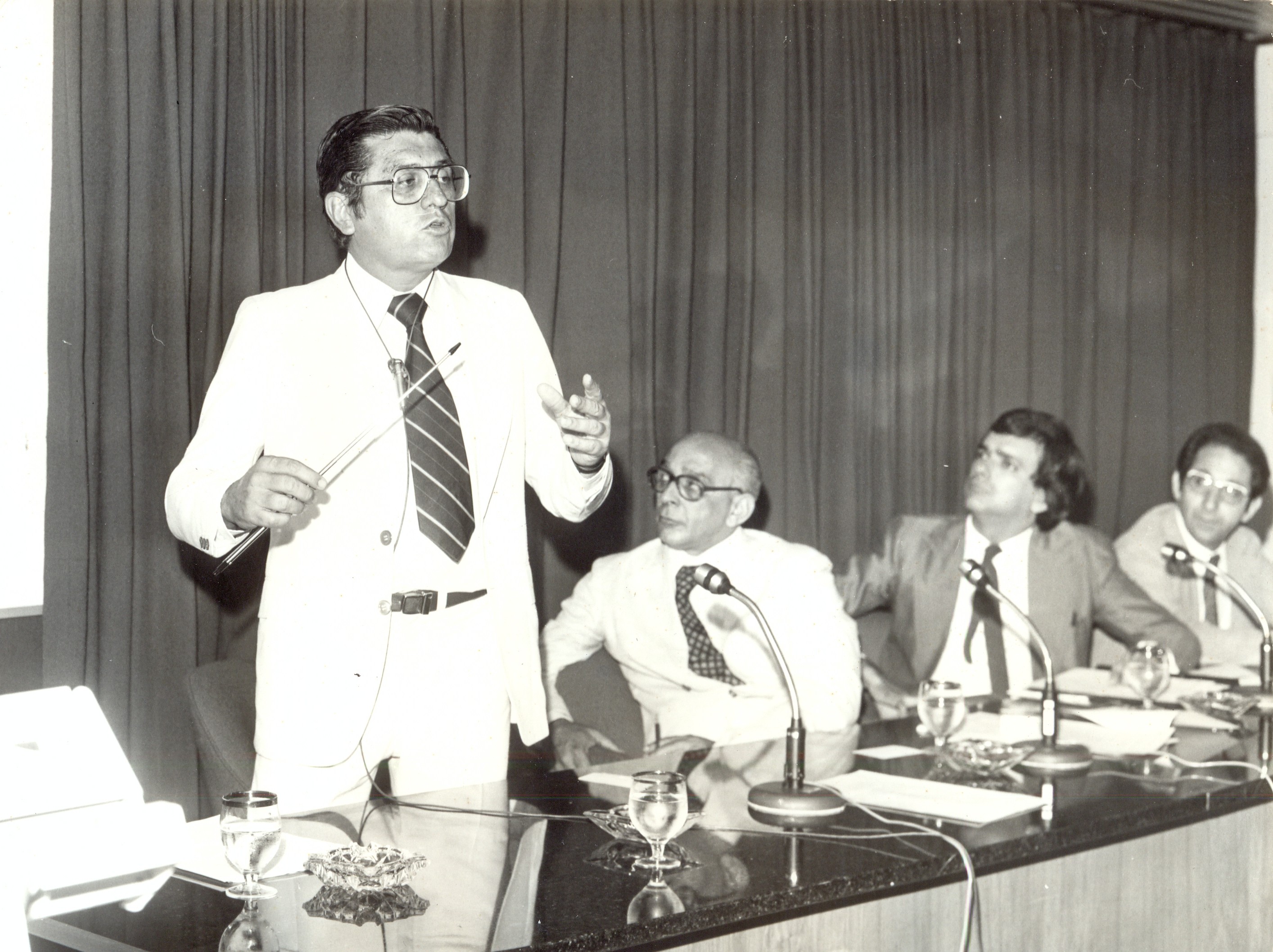 Simpósio "Minas Gerais na década de 80", promovido pela Fundação João Pinheiro (FJP), na comemoração do seu 10° aniversário, no auditório do Banco de Desenvolvimento de Minas Gerais (BDMG). Discursando o secretário de estado de ciência e tecnologia, Fernando Fagundes Neto. Vê-se, também, José Israel Vargas; o presidente da Fundação João Pinheiro (FJP), Antônio Octávio Cintra e Togo Nogueira de Paula.