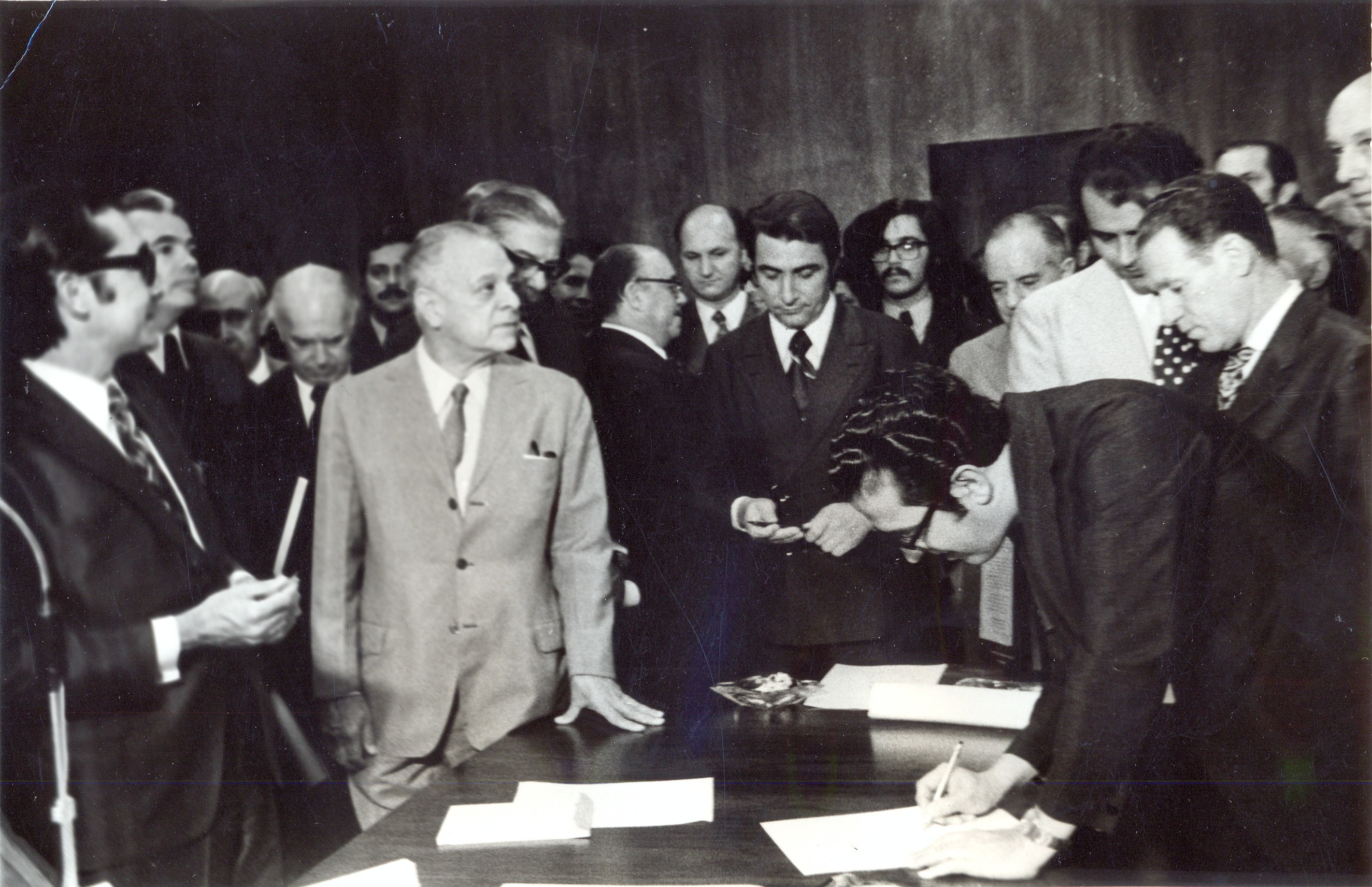 Assinatura do convênio entre o Ministério do Planejamento e a Fundação João Pinheiro (FJP), para execução de projetos de treinamento para altos executivos, como parte do "Programa Nacional de Treinamento de Executivos" (PNTE), criado pelo Ministério do Planejamento. Vê-se o ministro do planejamento, João Paulo dos Reis Veloso, além de outras autoridades.