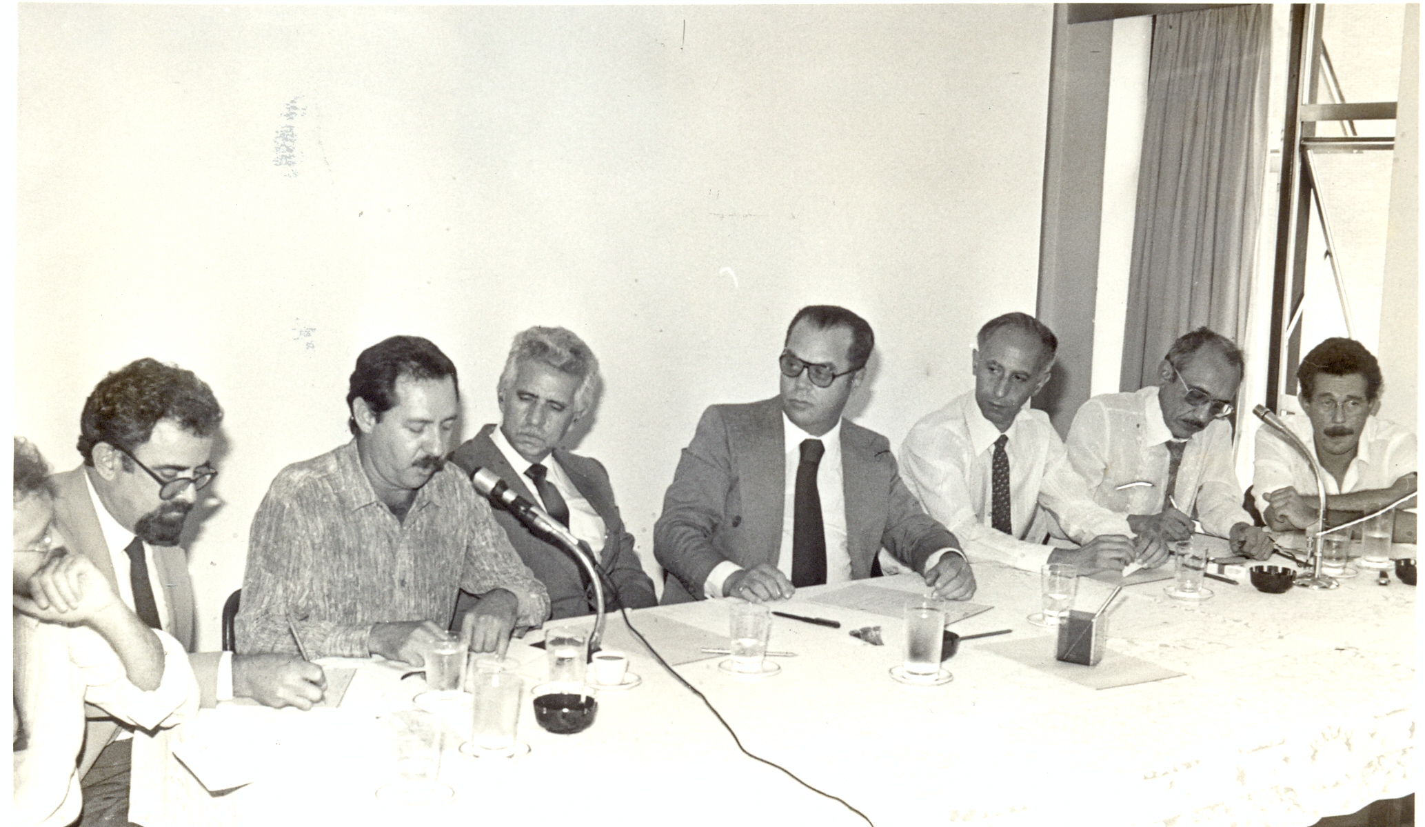 Painel sobre "Plano Cruzado", realizado na Fundação João Pinheiro (FJP). A partir da esquerda vê-se: Ronaldo Lamounier Locatelli; Teodoro Alves Lamounier; Clélio Campolina Diniz; Aluísio Pimenta; Hindemburgo Chateaubriand Pereira Diniz, presidente da FJP; Carlos Maurício de Carvalho Ferreira; Antônio Maria da Silveira e José Afonso Bicalho Beltrão da Silva.