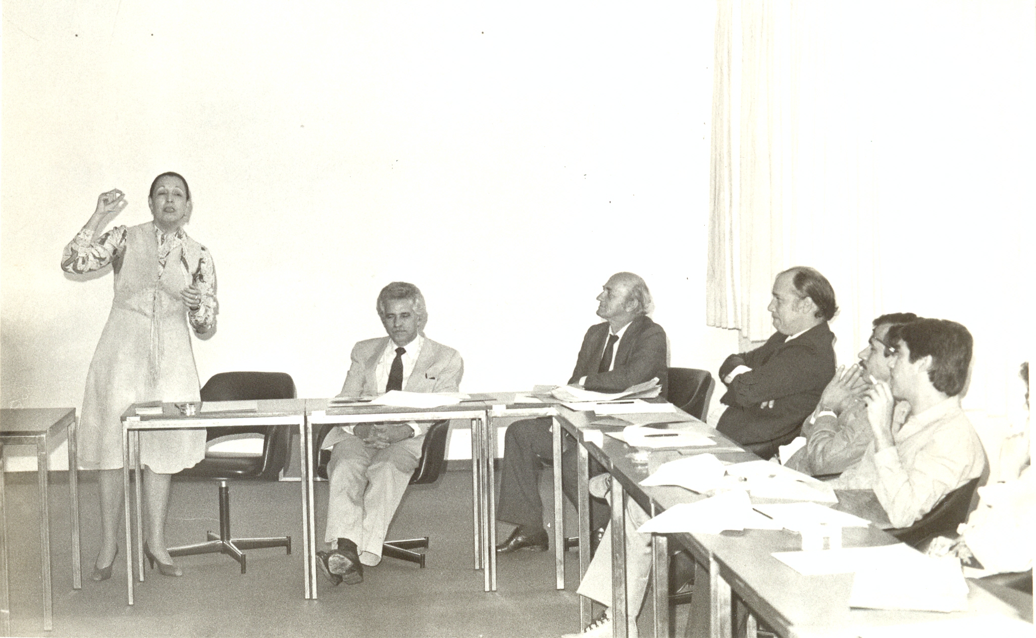 Palestra da professora Gilca Alves Wainstein, diretora geral do Centro de Desenvolvimento e apoio Técnico à Educação (CEDATE), no Centro de Desenvolvimento em Administração (CDA). Vê-se Gilca Alves Wainstein; Aluísio Pimenta, presidente da Fundação João Pinheiro (FJP); José Ernesto Ballstaedt, diretor do CDA; Heleno Antônio Pessoa; José Armando de Souza e Antônio Augusto Pereira Prates.