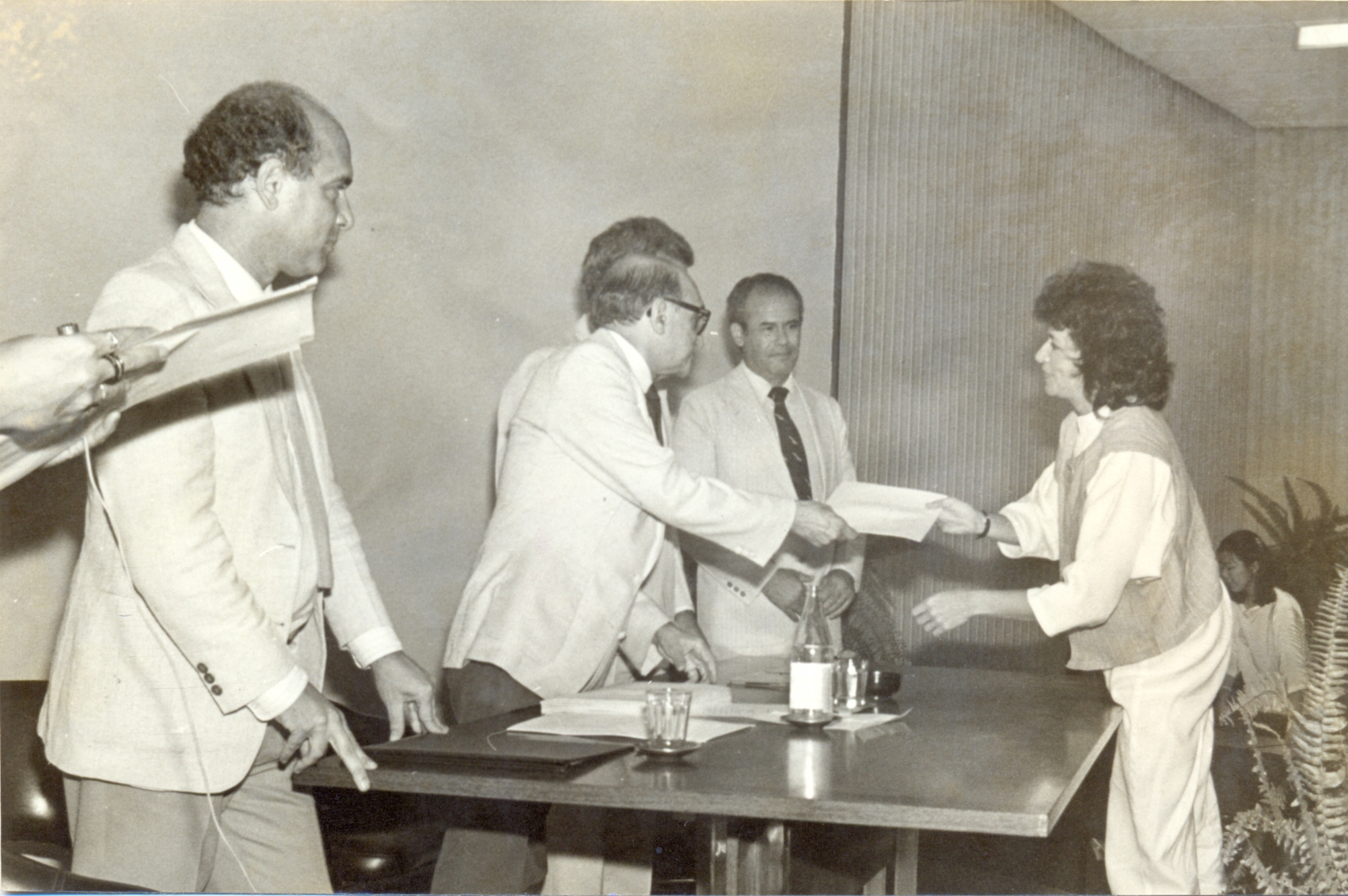 Júnia Maria de São Luiz Horta, técnica da Fundação João Pinheiro (FJP), por ocasião de sua formatura no III Programa de Especialização em Administração Pública (PEAP). Vê-se da esquerda para direita, Luciano Amorim Borges, coordenador e professor do curso; Pio Soares Canedo, diretor da FJP e Luíz Ciríaco Gonçalves, secretário adjunto da Administração.