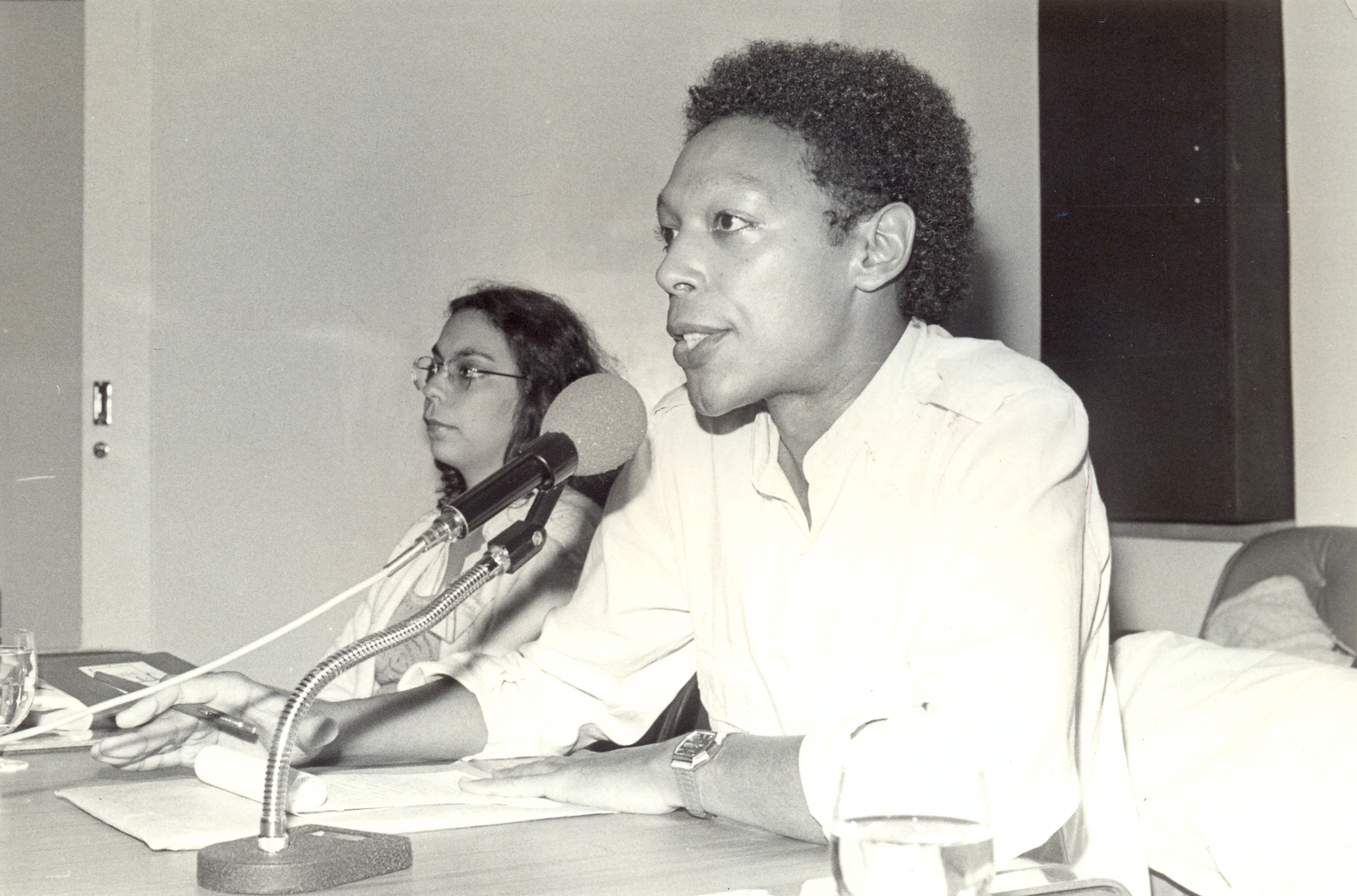 Seminário "África-Brasil: História, Política, Economia", pomovida pelo Núcleo de Relações Internacionais (NRI) da Fundação João Pinheiro (FJP) no auditório da Minas Caixa de 2 a 26 de abril. Conferência "Africa, uma prioridade para a política externa brasileira". Vê-se Angela Carrato, jornalista do Diário do Comércio e Dalmir Franciso, coordenador do Grupo de Trabalho "Luiz Negra" MG.