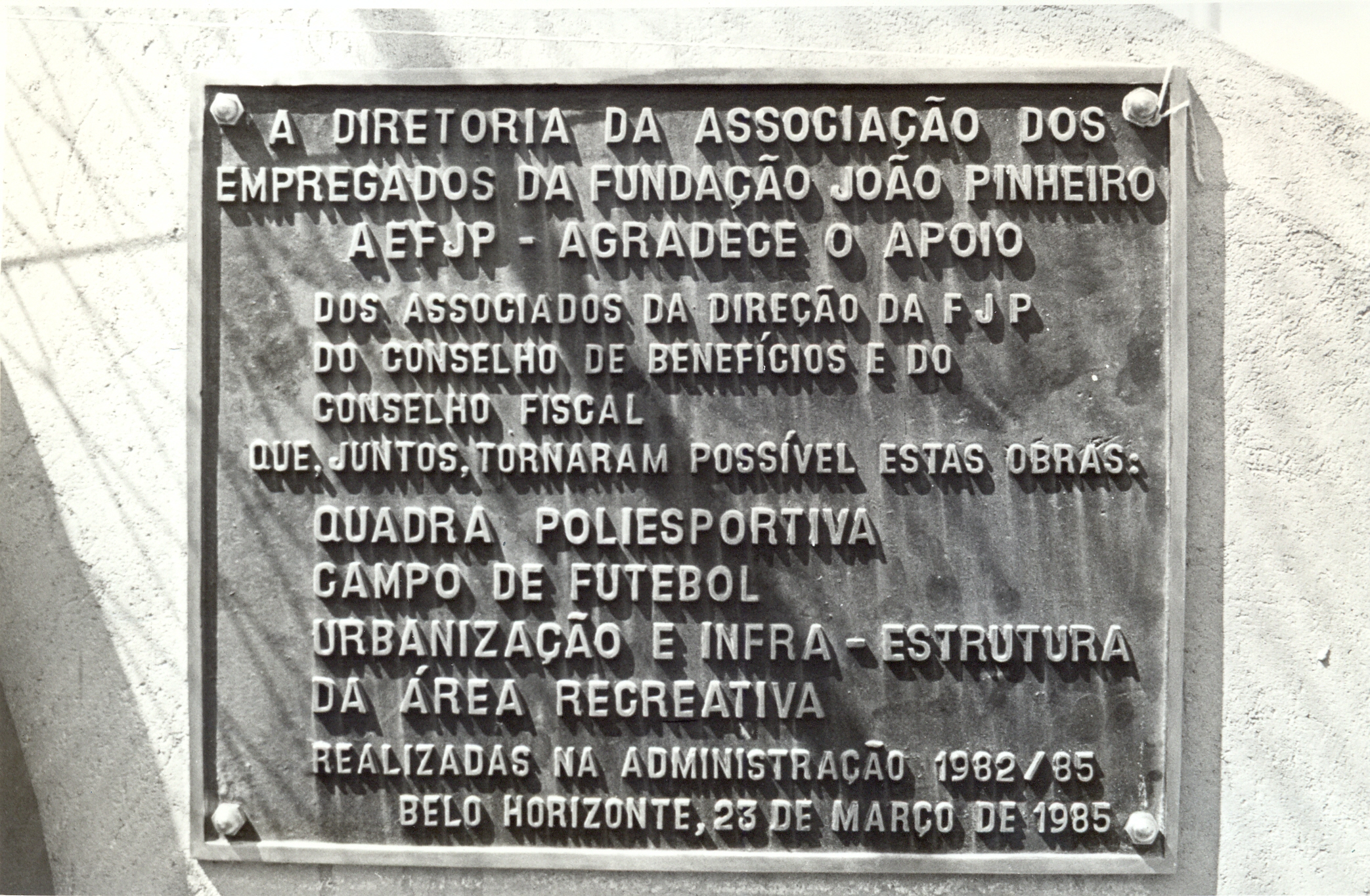 Inauguração da quadra poliesportiva da Associação dos Empregados da Fundação João Pinheiro (AE/FJP), na área recreativa. Vê-se a placa comemorativa.