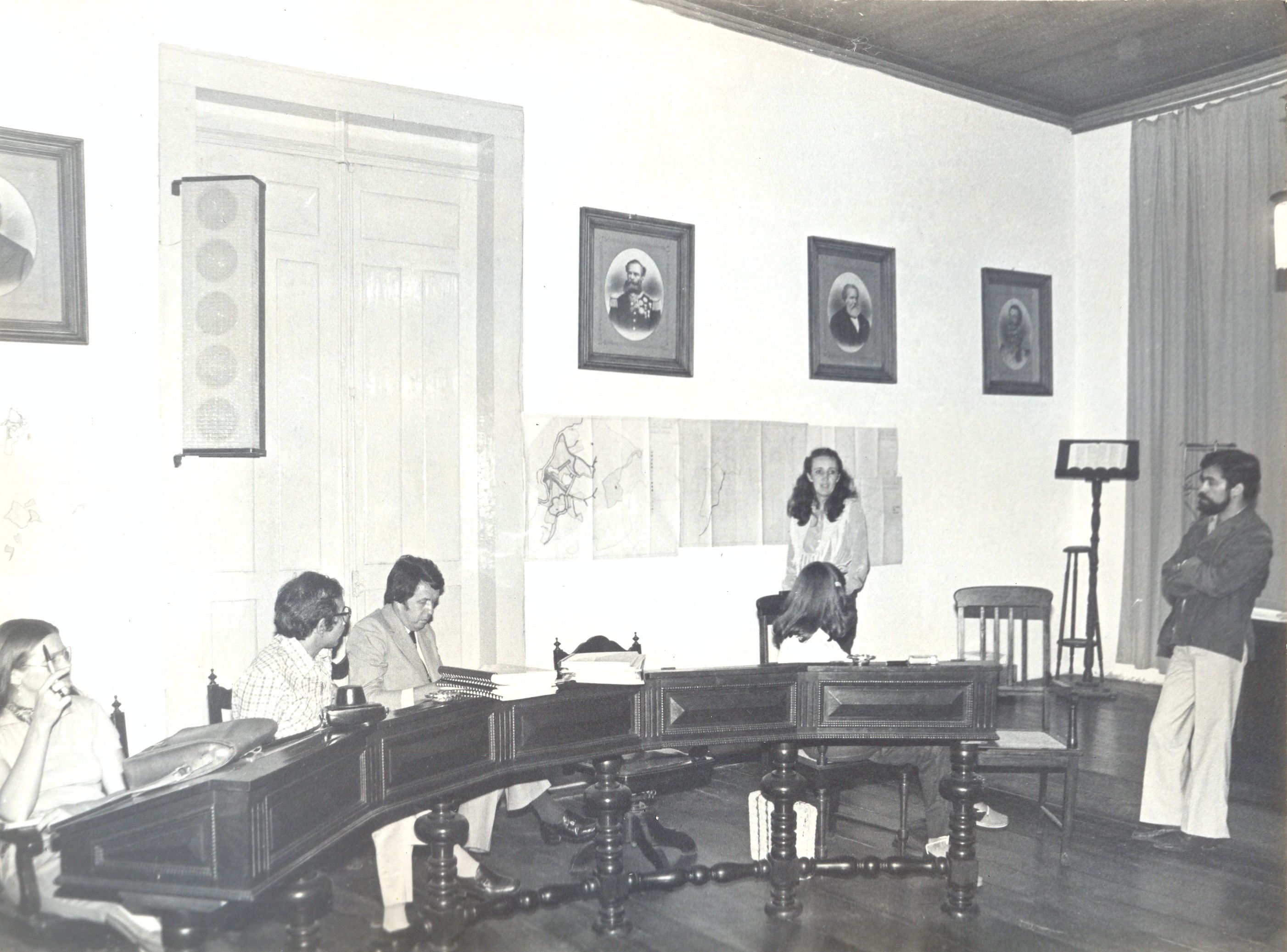 Reunião entre os técnicos da Fundação João Pinheiro (FJP) e o prefeito de Santa Bárbara, para a entrega do trabalho "Circuito de Santa Bárbara: organização espacial e preservação de sítios históricos". Vê-se, Mário Lima Belfort, Marieta de Campos Alves Vitorino, Geraldo Magella Barreto e Márcio Olympio Guimarães Henriques.