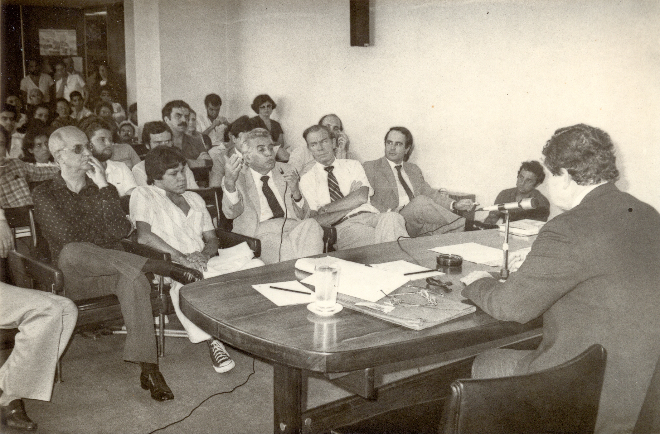 Thomas Skidmore brasilianista, diretor do Programa de Estudos Ibero-americanos, da Universidade de Wisconsin, EUA, pronunciava conferência sobre "O papel do Brasil no sistema internacional: implicações para a política norte-americana", no auditório da Fundação João Pinheiro (FJP). Na pimeira fila, vê-se Francisco Iglésias, Aluísio Pimenta, presidente da FJP.