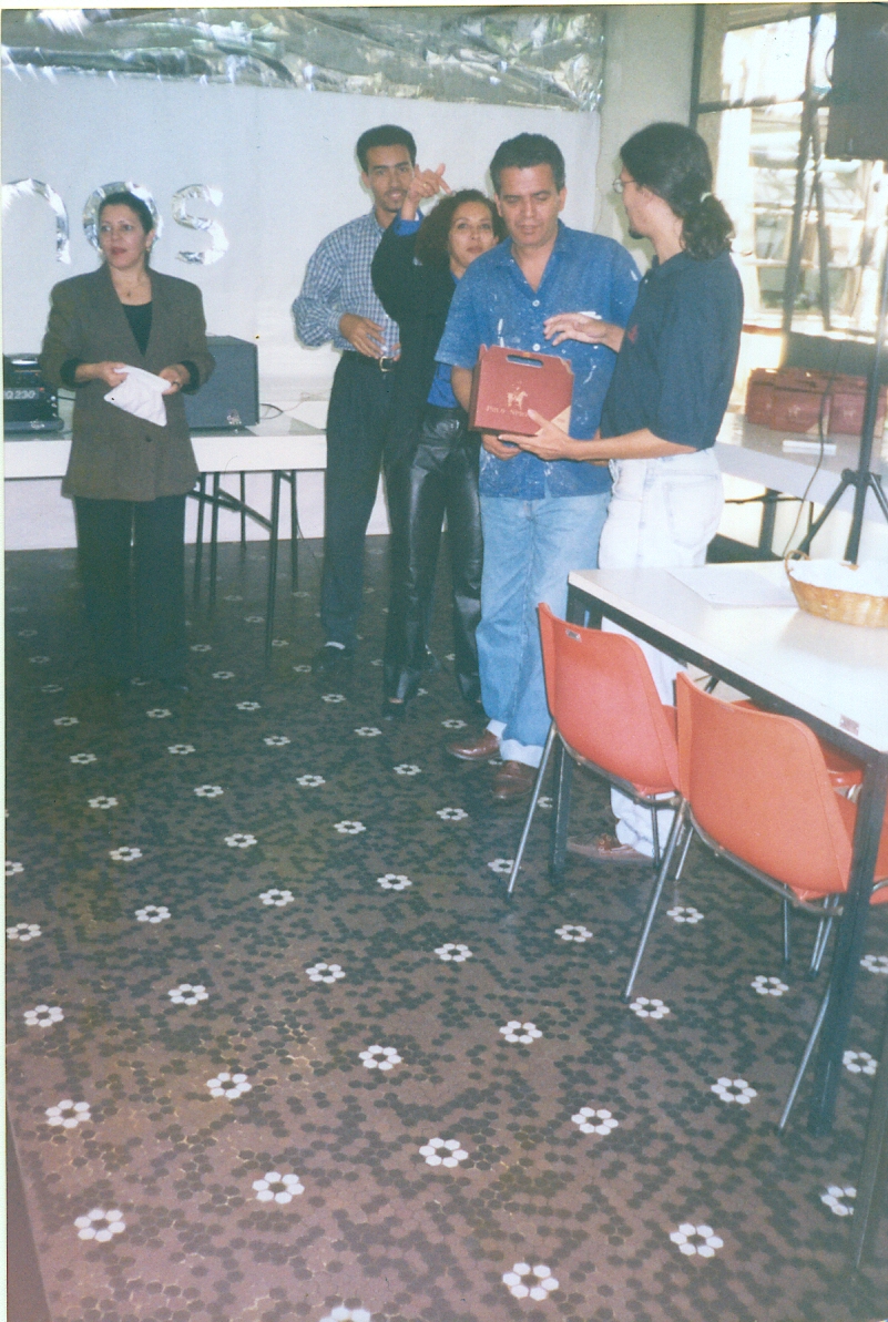 Aniversário de 25 anos da Associação de Empregados da Fundação João Pinheiro, no restaurante da Fundação João Pinheiro (campus Pampulha). Vê-se, da esquerda para a direita, Maria do Rosário Gomes Gonçalves (1º); Ângela Maria Reis (3º); Paulo Ramos Cordeiro (4º); Eustáquio Mário Ribeiro Braga (5º).