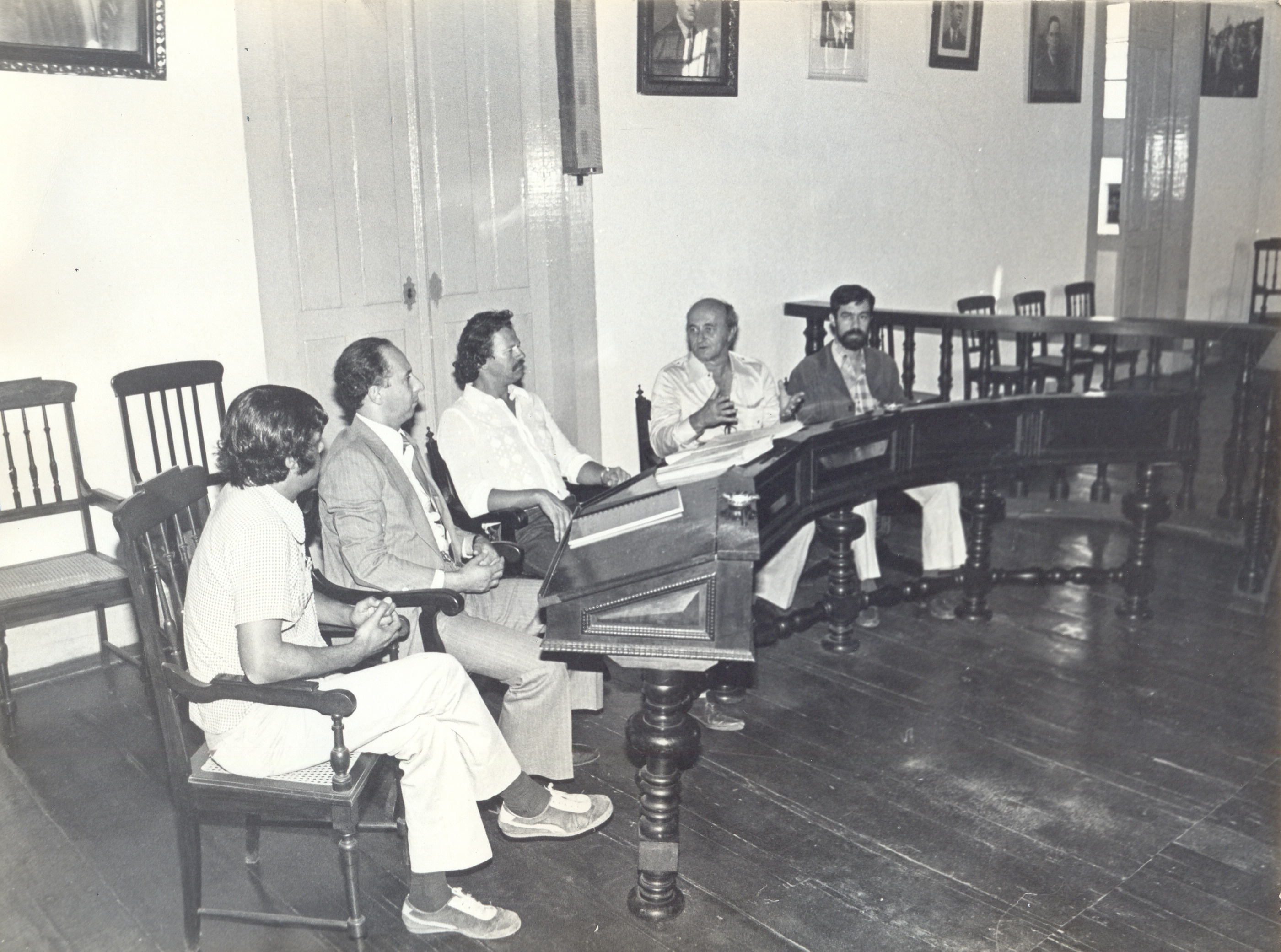 Reunião entre os técnicos da Fundação João Pinheiro (FJP) e o prefeito de Santa Bárbara, para a entrega do trabalho "Circuito de Santa Bárbara; organização espacial e preservação de sítios históricos". Vê-se o presidente da Fundação, Carlos Maurício de Carvlho Ferreira, o prefeito de Santa Bárbara, Severino Arcanjo de Sá, José Ernesto Ballstaedt e Mário Lima Belfort.