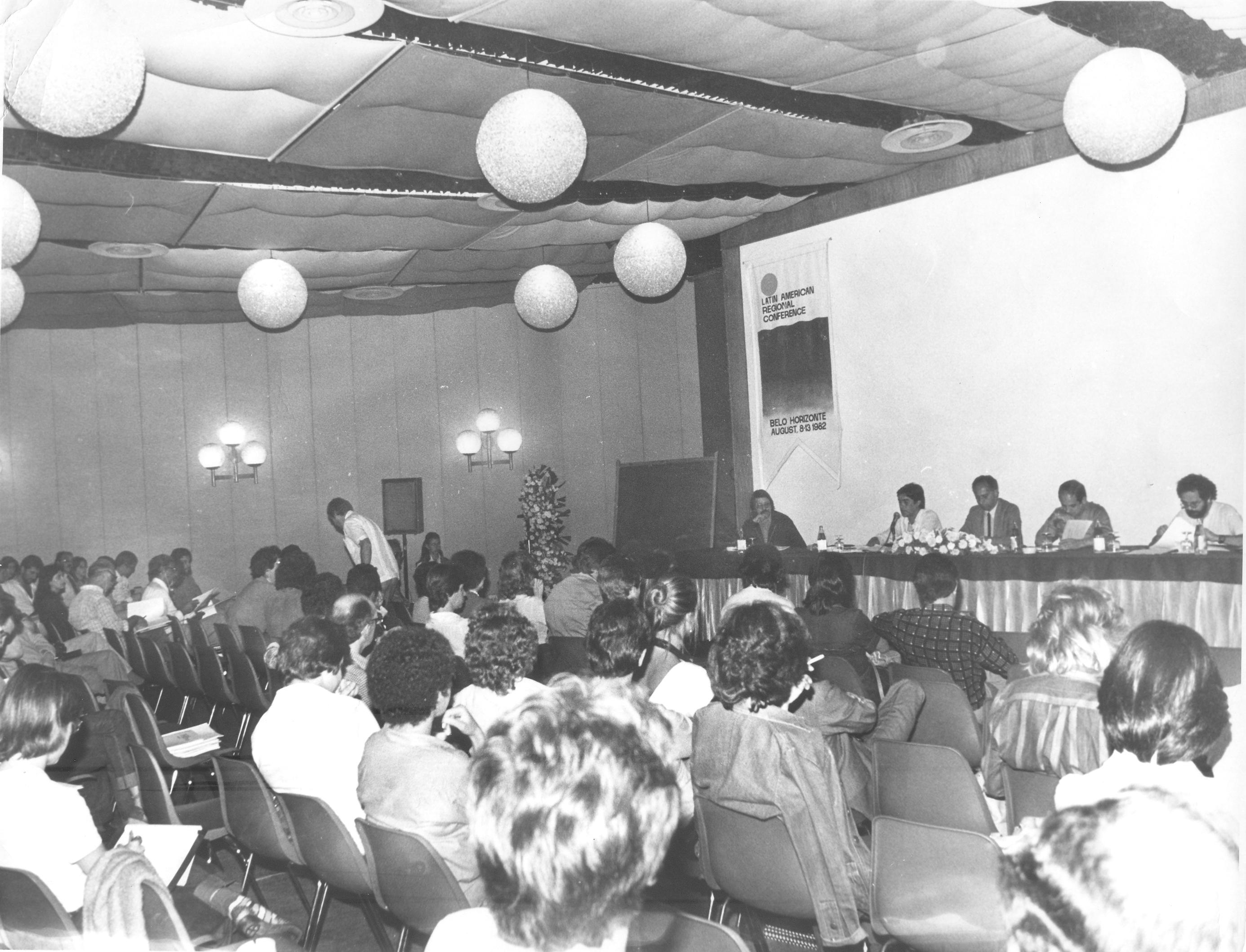 Imagem da Conferência Regional Latina-Americana organizada pela Fundação João Pinheiro entre 08 a 13 de agosto de 1992, em perspectiva os componentes da mesa e os participantes da conferência.