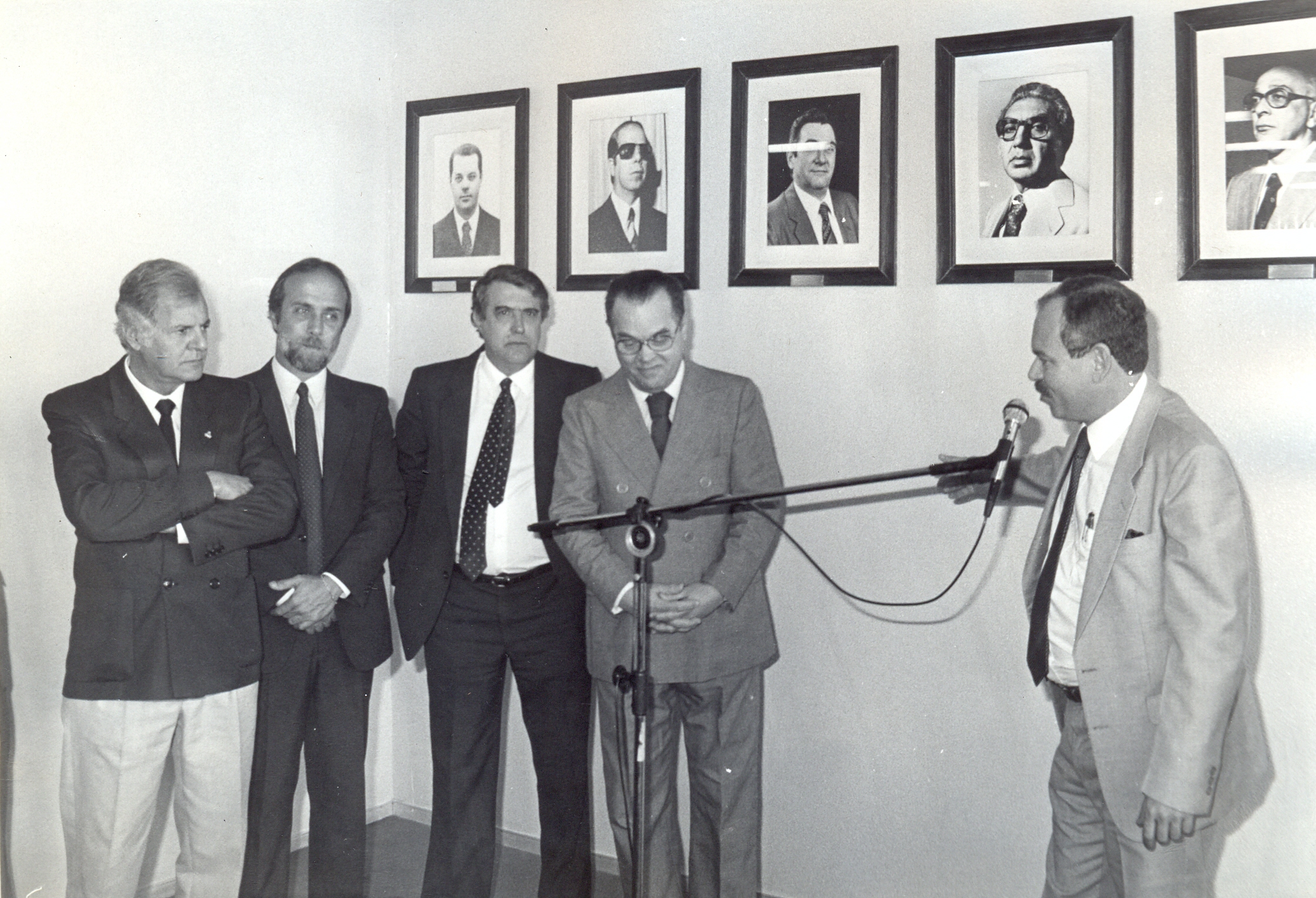 Inauguração do retrato de Hindemburgo Chateaubriand Pereira Diniz, na galeria de retratos dos ex-presidentes, no salão do conselho curador da Fundação João Pinheiro (FJP). Vê-se Sérgio Domingues França; Fernando Oliveira de Sá Andrade; Carlos Armando Gontijo César; de Hindemburgo Chateaubriand Pereira Diniz e Aluízio Gonçalves Werneck, presidente da Fundação João Pinheiro, discursando.