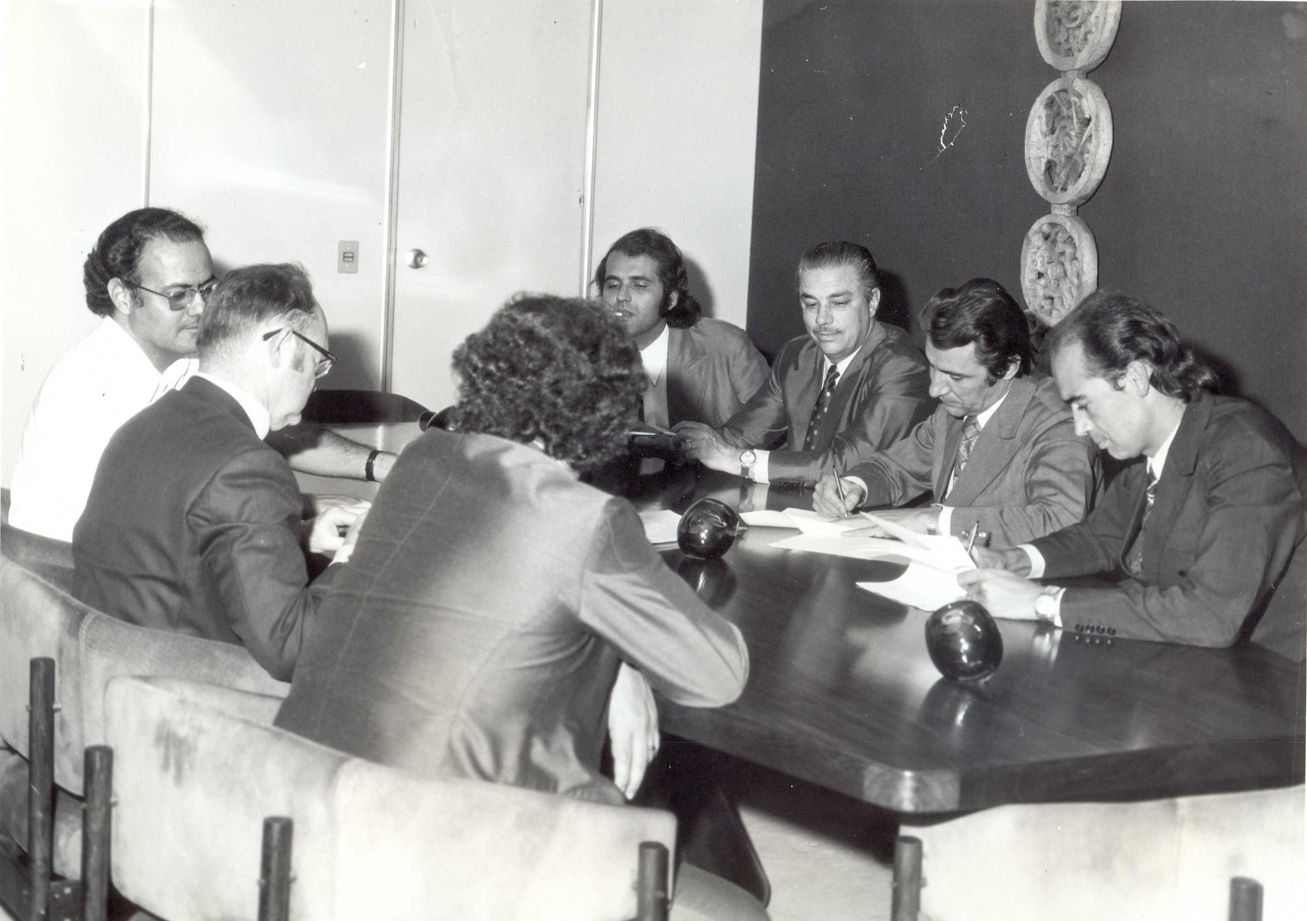 Assinatura do contrato entre a Fundação João Pinheiro (FJP), Centro de Assistência Gerencial de Minas Gerais (CEAG) e Fundação Universidade Federal de Minas Gerais (UFMG) para desenvolvimento de um programa integrado de educação e pesquisa, o contrato foi denominado PROJETO CDA e foi assinado por Felipe Erasmo Cabral, superintendente do CDA, professor Pedro Arthur Wilke, diretor da FUMG, Luis de Oliveira Castro, presidente da Fundação João Pinheiro (FJP) e Walternômen Coelho dos Santos, diretor executivo do CEAG-MG, Garland Chester Owens, coordenador dos cursos da Universidade de Colúmbia.