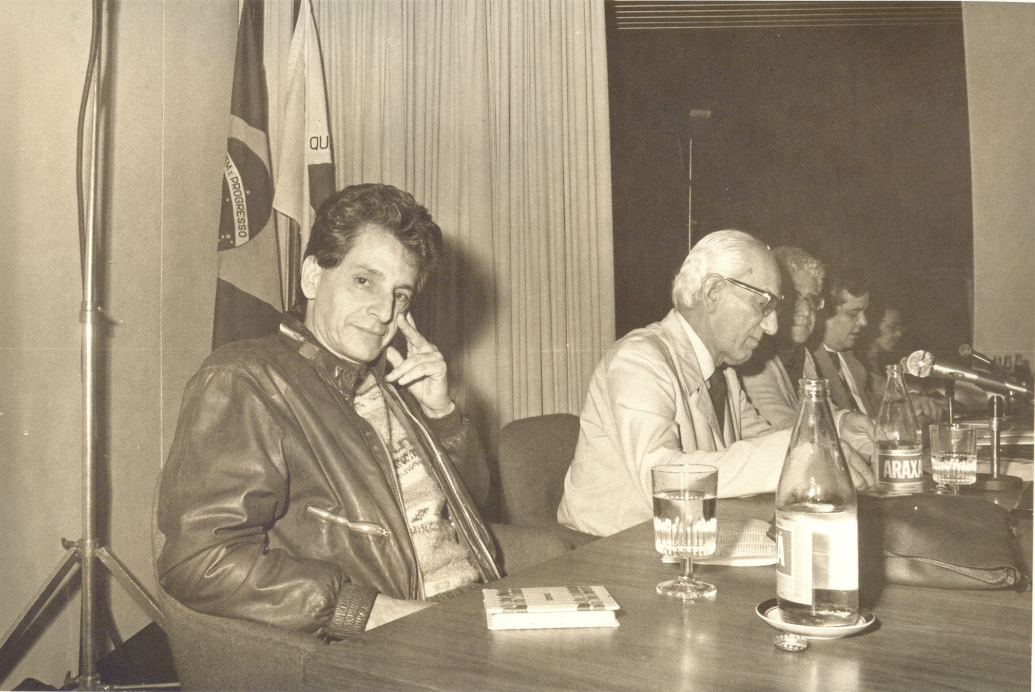 Seminário " Sociedade, Cultura e Tecnologia" promovido pela Fundação João Pinheiro (FJP) no auditório do Banco do Desenvolvimento de Minas Gerais (BDMG). Sessão VIII: Nova tecnologias e os cenários do futuro. A partir da esquerda vê-se Fernando Gabeira; Amilcar Oscar Herrera; Jarbas Nogueira de Medeiros Silva, moderador; Evaldo Santos Pinheiro e Jorge Dantas.