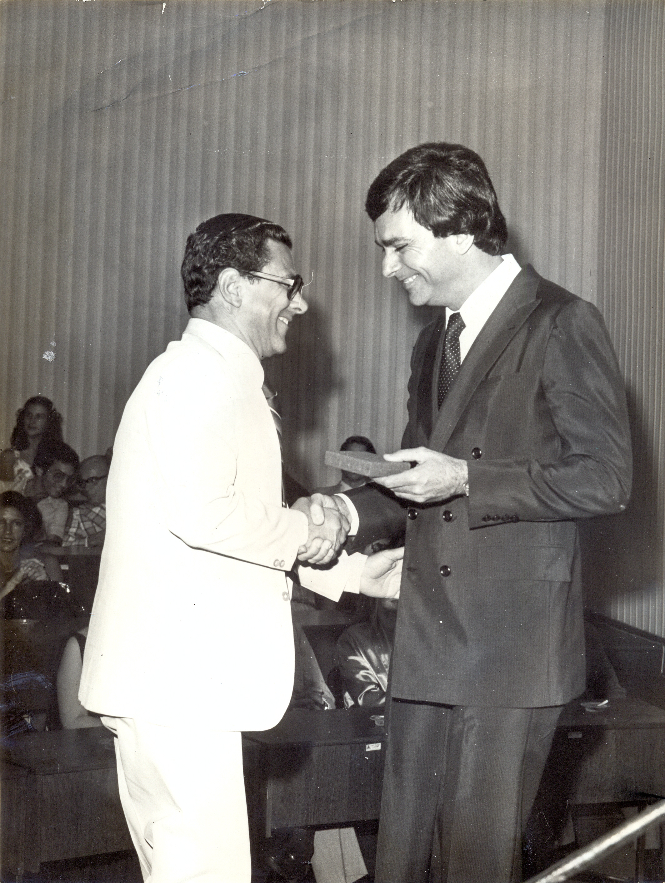 Entrega da placa de prata aos funcionários mais antigos, pela comemoração do 10° aniversário da Fundação João Pinheiro (FJP). Vê-se Antônio Octávio Cintra entregando a placa a Celso de Azevedo Andrade.