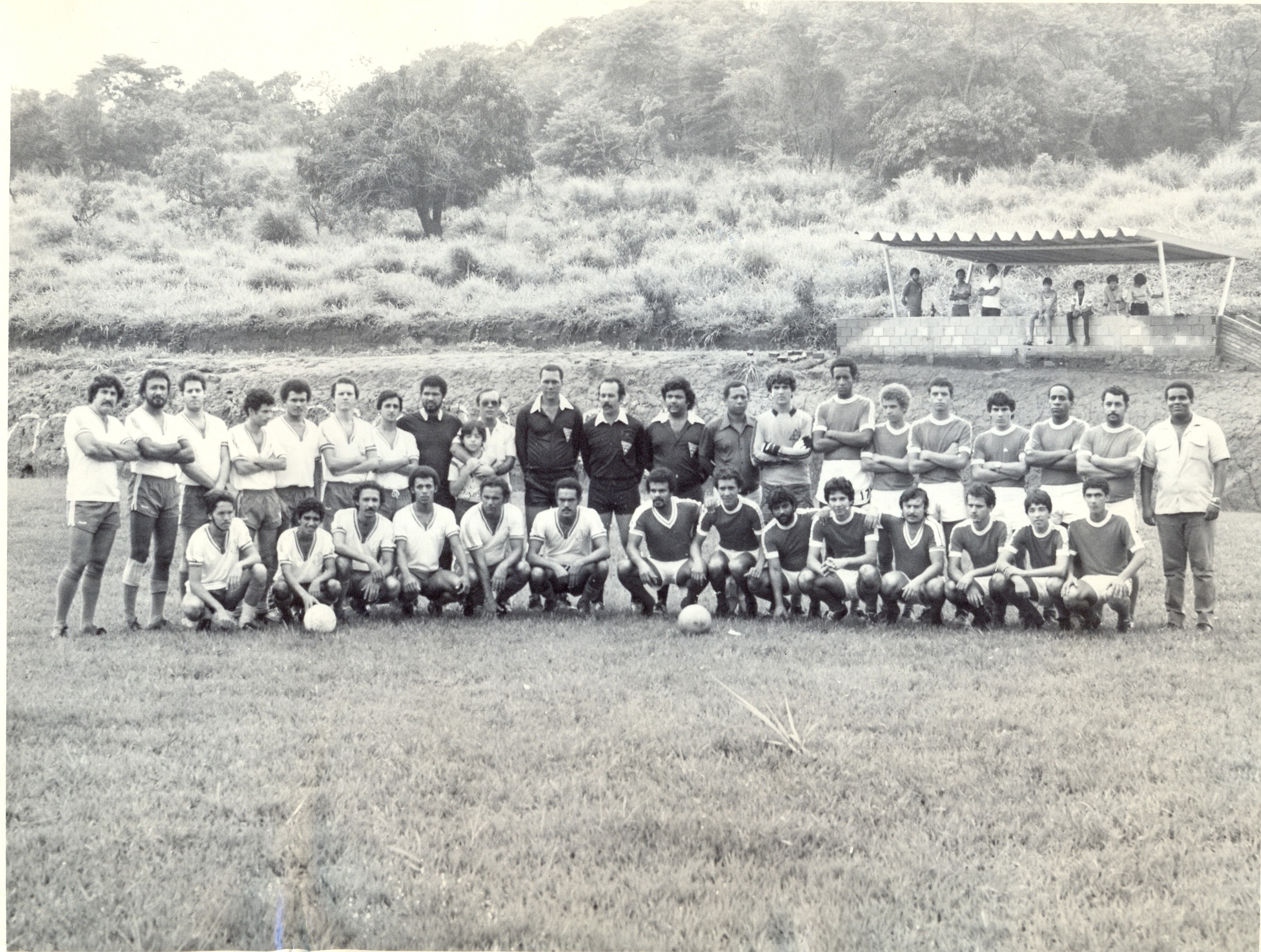 Time de futebol da Associação dos Empregados da Fundação João Pinheiro (AE/FJP) e da Secretaria de Estado do Planejamento (SEPLAN), no torneio esportivo entre a FJP e SEPLAN, durante a comemoração da inauguração da piscina da Área Recreativa da Fundação João Pinheiro (AE/FJP).