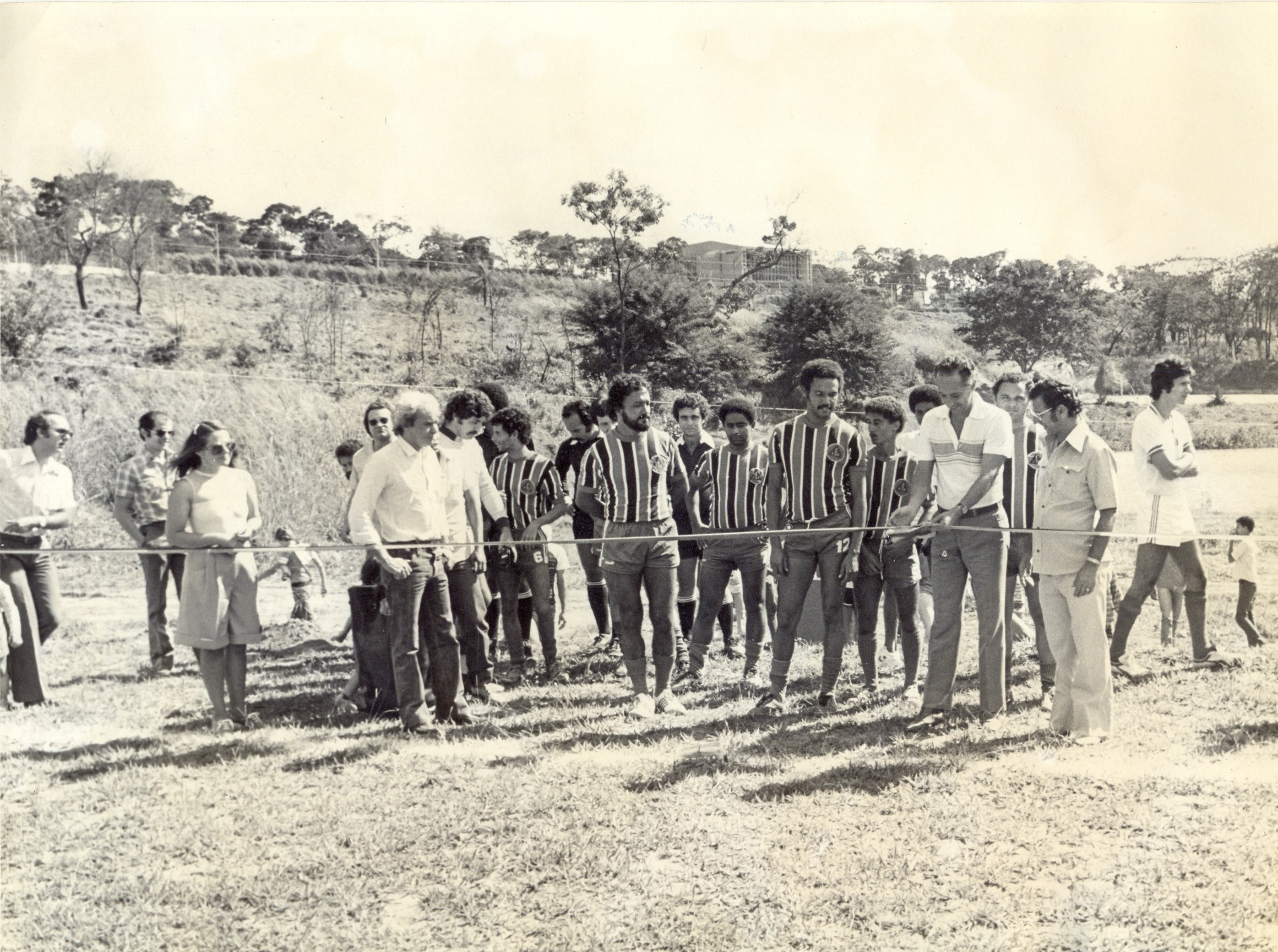 Corte de fita, na inauguração do campo de futebol da Associação dos Empregados (AE) da Fundação João Pinheiro (FJP), pelo presidente da Fundação João Pinheiro (FJP), Carlos Maurício de Carvalho Ferreira. Vendo-se, também entre outros, Alnir Marco Shreiber e Geraldo Majella Moreira Duarte.