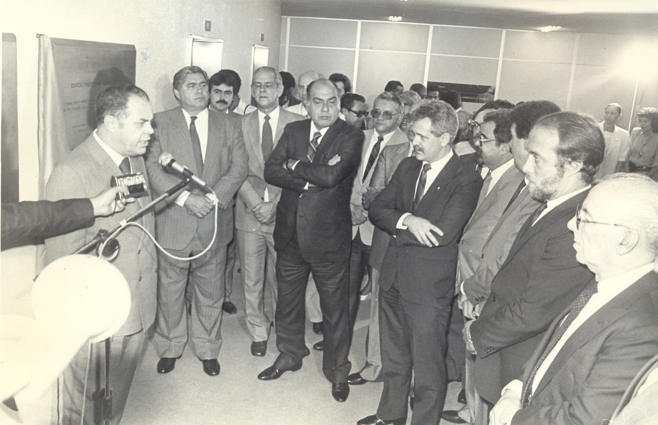 Hindemburgo Chateaubriand Pereira Diniz, discursando após o descerramento das placas comemorativas de inauguração da sede própria da Fundação João Pinheiro (FJP). Vê-se a partir da esquerda: em primeiro plano - Hindemburgo Chateaubriand Pereira Diniz, presidente da FJP; Newton Cardoso, governador eleito; Sérgio Mário Ferrara, prefeito de Belo Horizonte; Hélio Carvalho Garcia, governador do Estado de Minas Gerais; Luíz Alberto Rodrigues secretario de Estado do Planejamento; Teodoro Alves Lamounier, diretor da FJP; Fernando Oliveira de Sá Andrade, diretor da FJP e outros.
