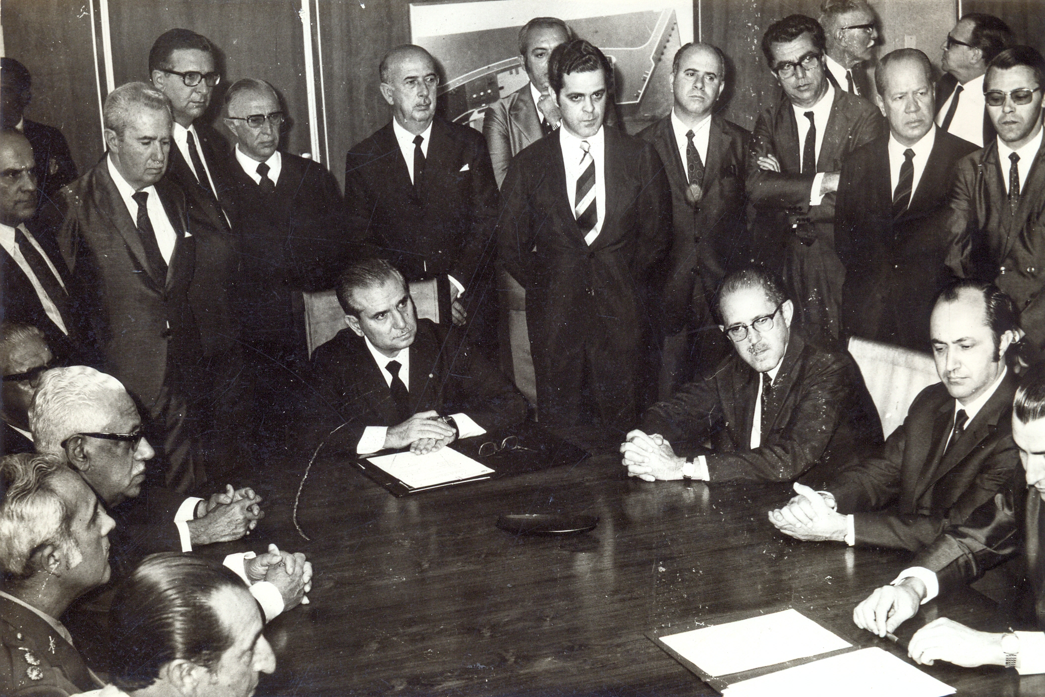 Assinatura do contrato, no Palácio dos Despachos, pelo Governador Rondon Pacheco, com a Fundação João Pinheiro, para elaboração do Plano de Desenvolvimento Integrado da Região Metropolitana de Belo Horizonte, pelo Planejamento da Região Metropolitana de Belo Horizonte (PLAMBEL). Vê-se o Governador Rondon Pacheco; o secretário do Planejamento, Paulo José de Lima Vieira; o secretário de Viação, Ildeu Duarte Filho; o Presidente da Fundação João Pinheiro (FJP), Luis de Oliveira Castro, além de várias autoridades.