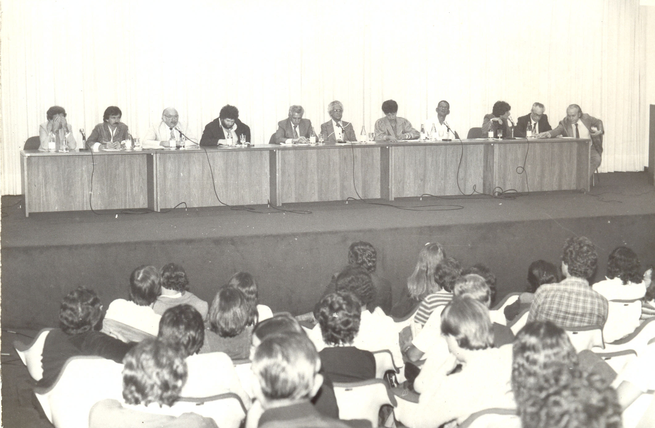 Debate sobre o filme "Jango" de Sílvio Tendler, promovido pela Fundação João Pinheiro (FJP), no auditório do Banco de Desenvolvimento de Minas Gerais (BDMG). Vê-se a platéia.