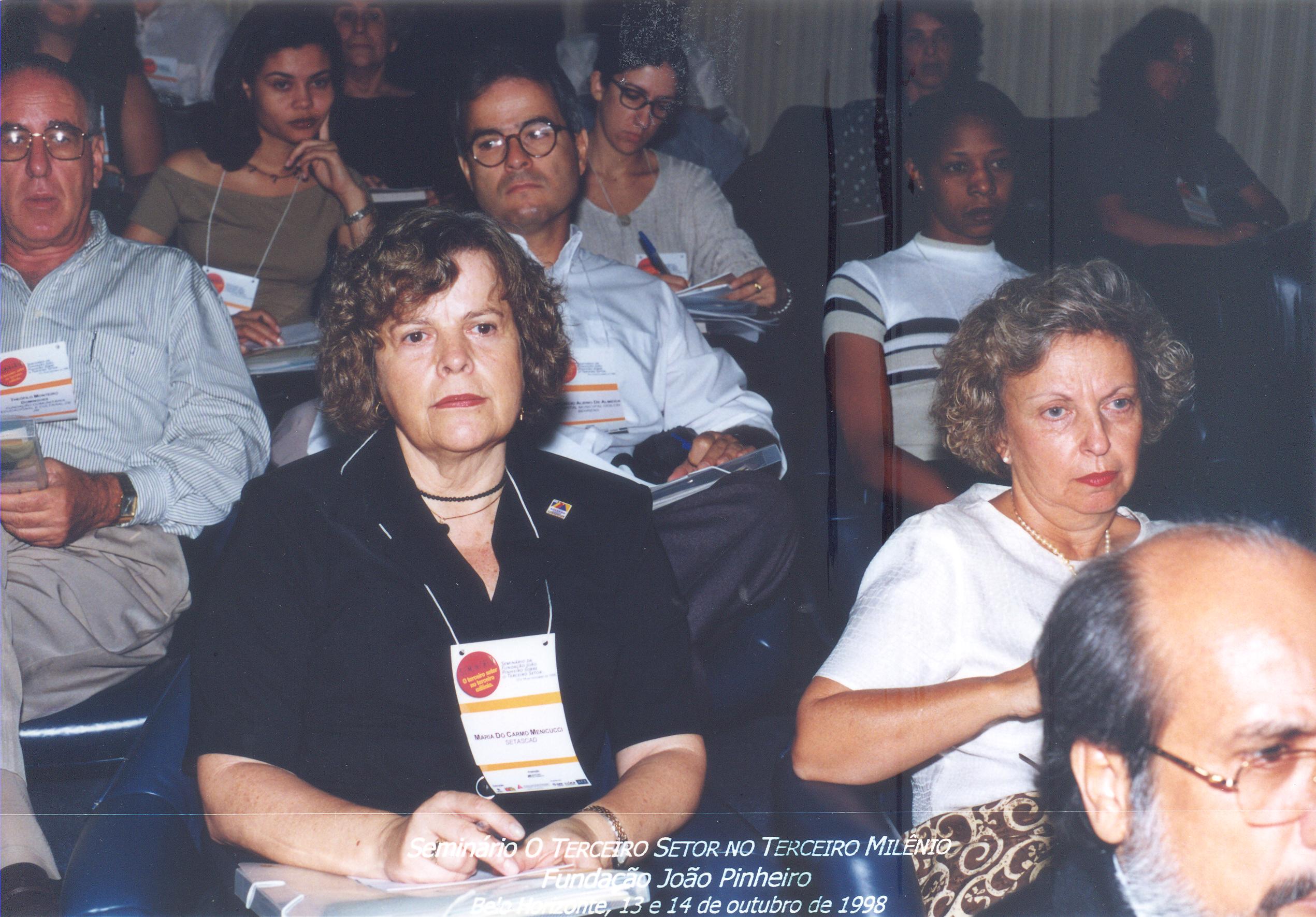 Imagem de Maria do Carmo Menecucci (a esquerda) e Maria Beatriz Gonçalves (a direita) participantes do seminário O Terceiro Setor no Terceiro Milênio, no auditório principal da Fundação João Pinheiro, ocorrido nos dias 13 e 14 de outubro de 1998.