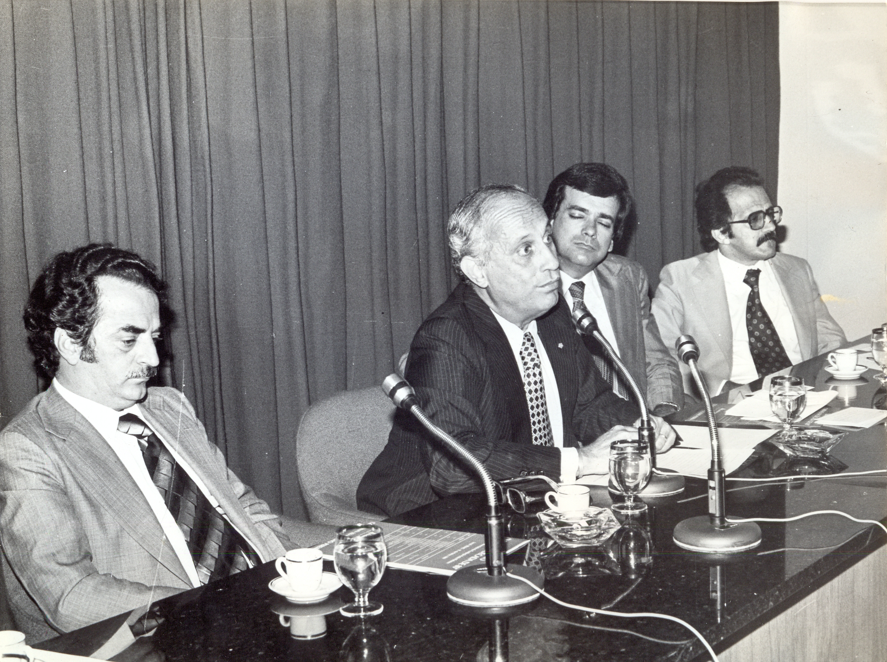 Simpósio "Minas Gerais na década de 80", promovido pela Fundação João Pinheiro (FJP), na comemoração do seu 10° aniversário, no auditório do Banco de Desenvolvimento de Minas Gerais (BDMG). Vê-se, da esquerda para direita, João Pedro Gustin, Murilo Macedo, ministro do trabalho, Antônio Octávio Cintra, presidente da Fundação João Pinheiro (FJP) e Paulo Roberto Haddad.
