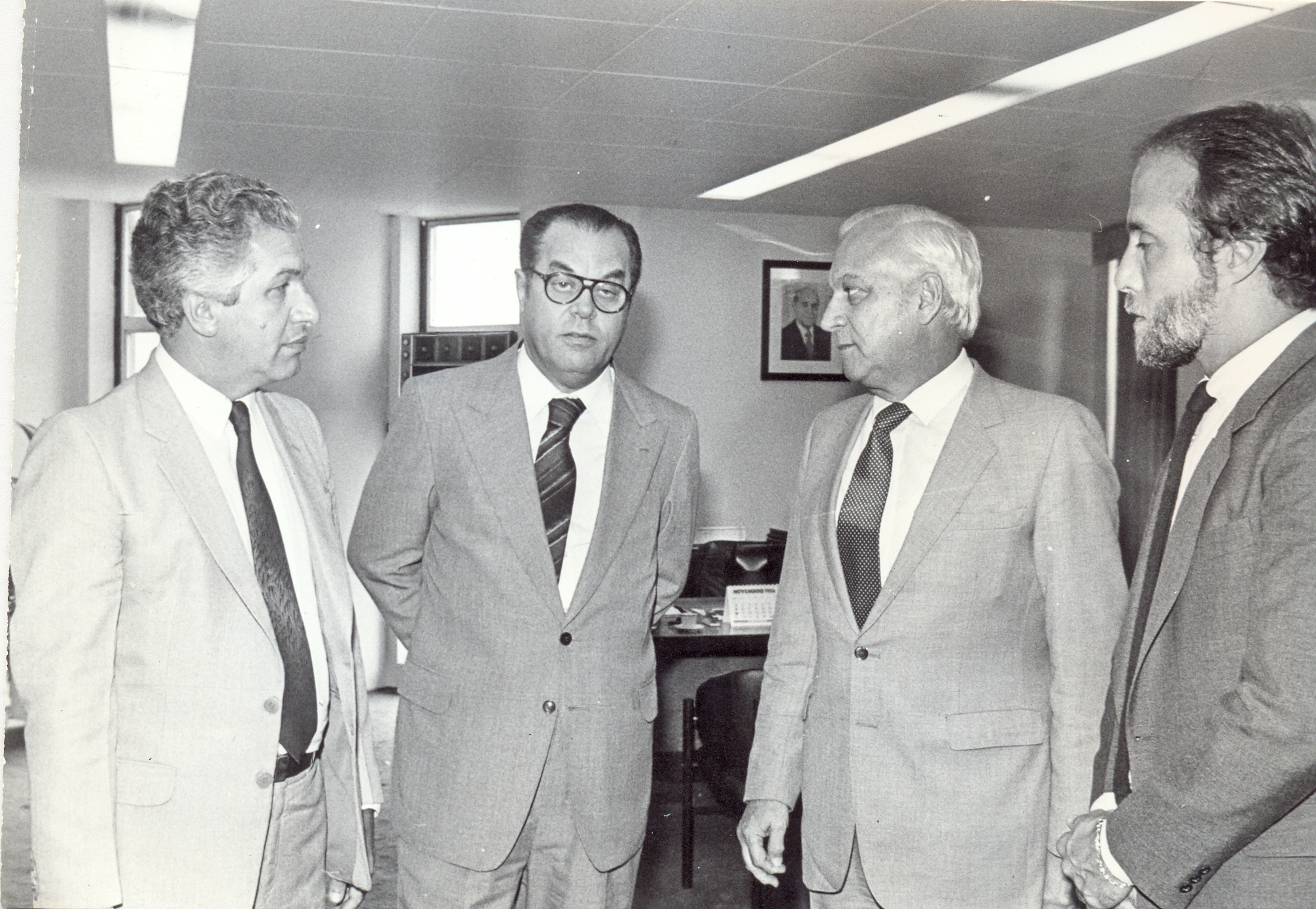 Assinatura do convenio entre a Fundação João Pinheiro (FJP) e Instituto de Administração Financeira da Previdência e Assistência Social (IAPAS), para elaboração, pela FJP, do projeto de modernização da estrutura e aprimoramento dos recursos humanos do IAPAS. Vê-se a partir da esquerda: Salomão Souza Lima, do IAPAS; Hindemburgo Chateaubriand Pereira Diniz, presidente da FJP; Eugênio Doin Vieira, do IAPAS e Fernado Oliveira de Sá Andrade.