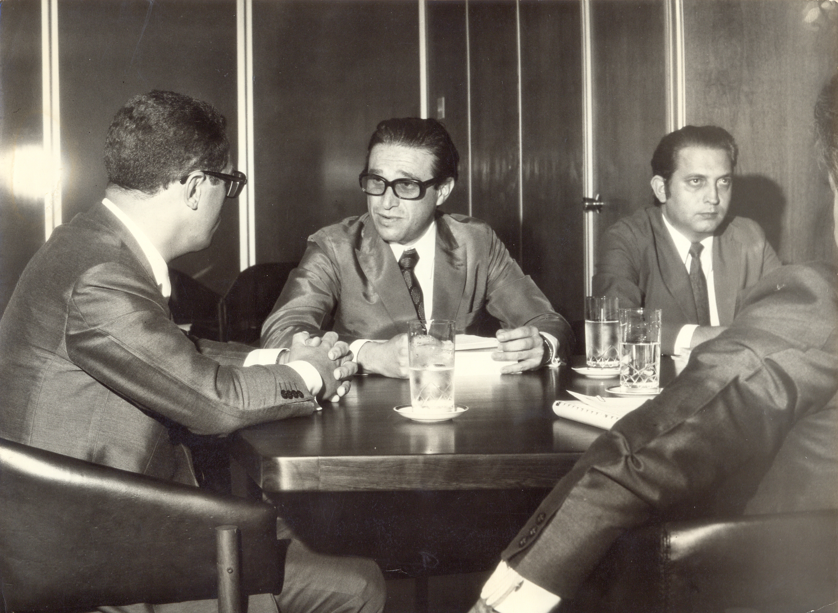 Reunião na Fundação João Pinheiro entre o presidente da FJP (Hindemburgo Chateaubriand Pereira Diniz), Silviano Cançado de Azevedo e Marneu Ferreira Starling com técnicos do Banco de Desenvolvimento de Minas Gerais (BDMG), para apresentação dos trabalhos concluídos pela Fundação João Pinheiro (FJP).