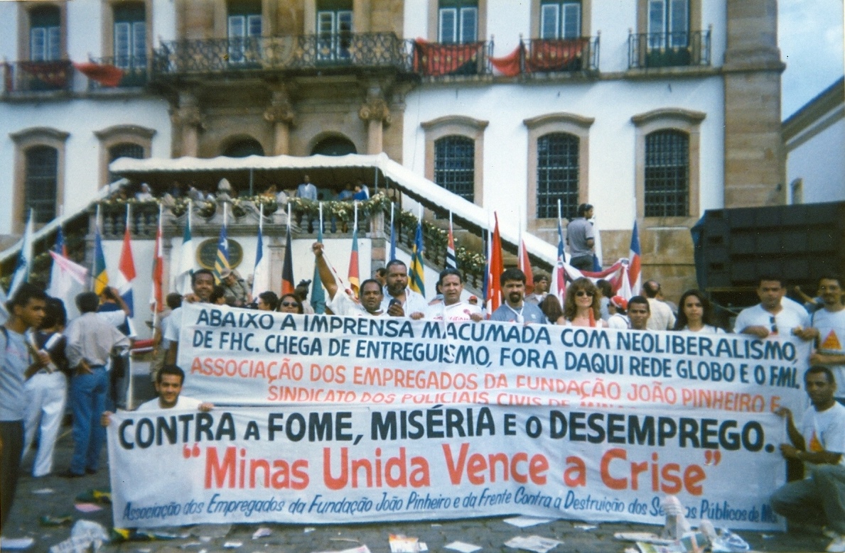 Participação da Associação de Empregados da Fundação João Pinheiro na manifestação contra a corrupção, fome e desemprego, em Ouro Preto (MG), na Praça Tiradentes. Vê-se, da esquerda para a direita, de pé, Edmar Alves da Silva (1º); Maria Amélia Alves Vitorino (7º); Davidson Lopes de Figueiredo (10º); Eustáquio Mário Ribeiro Braga (11º). Agachados, Milton Luciano Rodrigues (1º); Jorge Eduardo da Silva (2º).