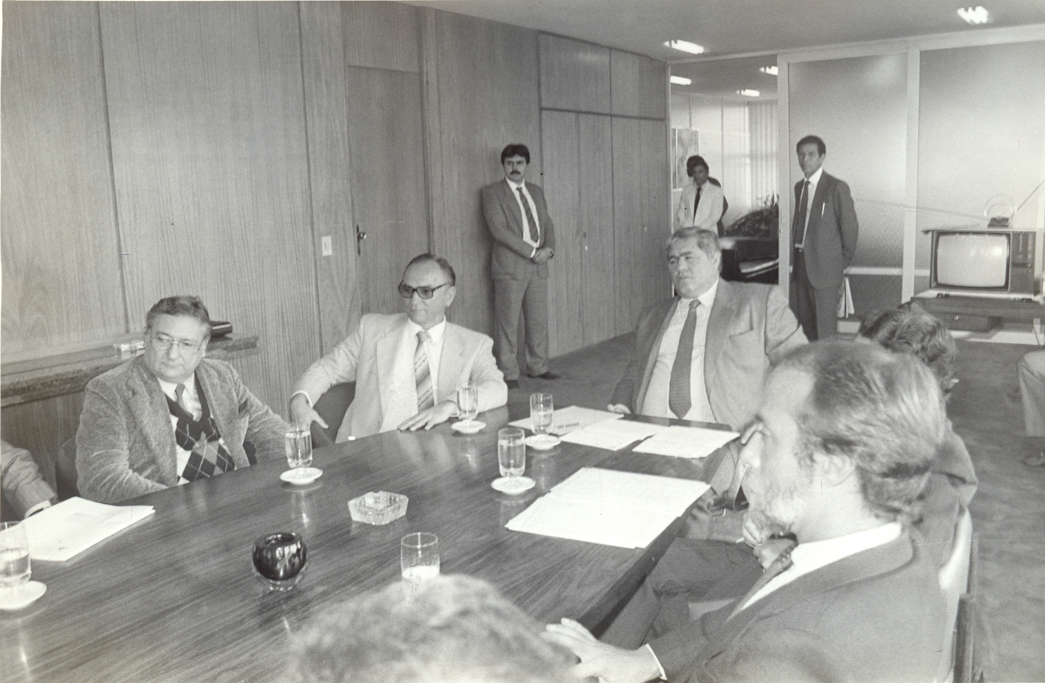 Reunião do governador do Estado de Minas, Newton Cardoso, com a diretoria da Fundação João Pinheiro (FJP). Vê-se a partir da esquerda: Antônio Lopes Sá; Hamilton Parma, presidente da FJP; Newton Cardoso, governador do Estado de Minas Gerais e Fernando Oliveira de Sá Andrade.