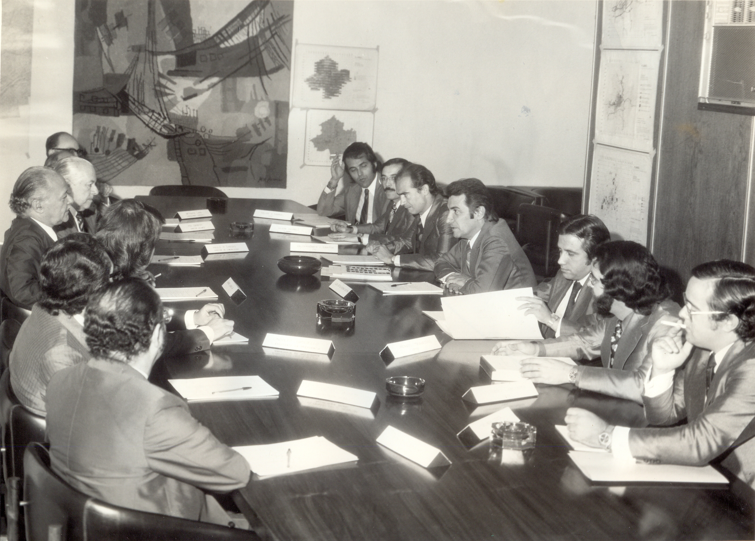 Visita do presidente da USIMINAS, Amaro Lanari Júnior à Fundação João Pinheiro. Vê-se à esquerda Amaro Lanari Júnior, Paulo Pinheiro Chagas, Diretor de Comunicação da Fundação João Pinheiro (FJP). À direita, vê-se entre outros, Felipe Erasmo Cabral, do Centro de Desenvolvimento em Administração (CDA), Gilson de Assis Dayrell, do Planejamento da Região Metropolitana de Belo Horizonte (PLAMBEL), Walternômen Coelho dos Santos, Luis de Oliveira Castro, presidente da FJP, Teodoro Alves Lamounier.