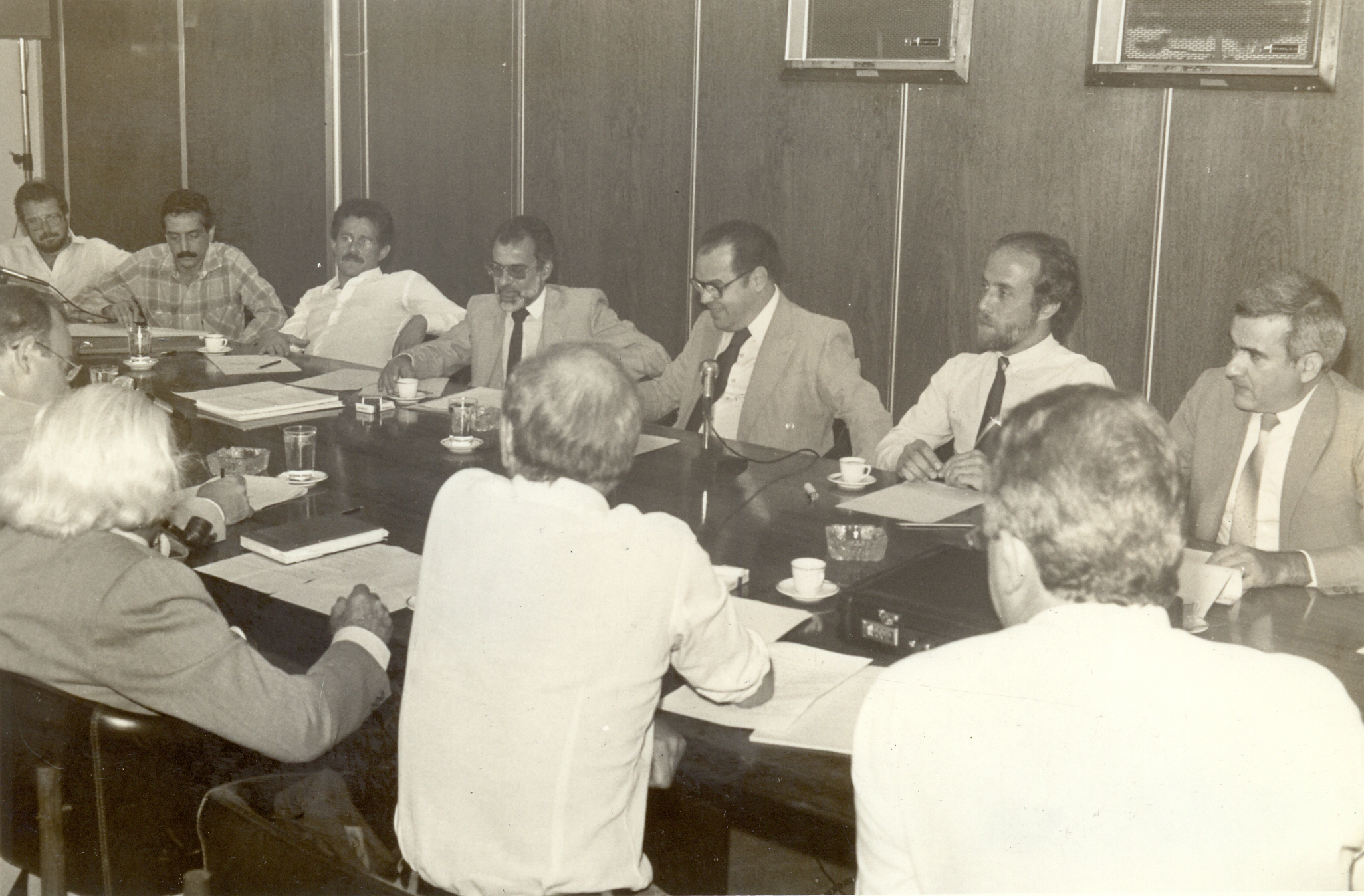 Reunião da Diretoria e técnicos da Fundação João Pinheiro (FJP), com técnicos do Ministério da Irrigação, na FJP. Vê-se à mesa, de frente a partir da esquerda: Ronaldo Lamounier Locatelli, Álvaro Ramalho Júnior, José Afonso Bicalho Beltrão da Silva, Carlos Eduardo Côdo Aroeira, Hindenburgo Chateaubriand Pereira Diniz, Fernando Oliveira de Sá Andrade e Vicente de Paula Mendes.