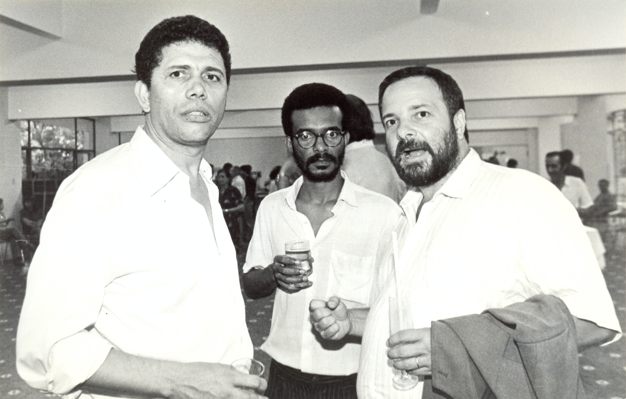 Coquetel de congraçamento dos funcionários da Fundação João Pinheiro, em comemoração aos 20 anos da Instituição, após as solenidades no auditório. Vê-se a partir da esquerda Ivani Gonçalves Cunha; Francisco Batista Teixeira e João Luiz Traverso Gonçalves.