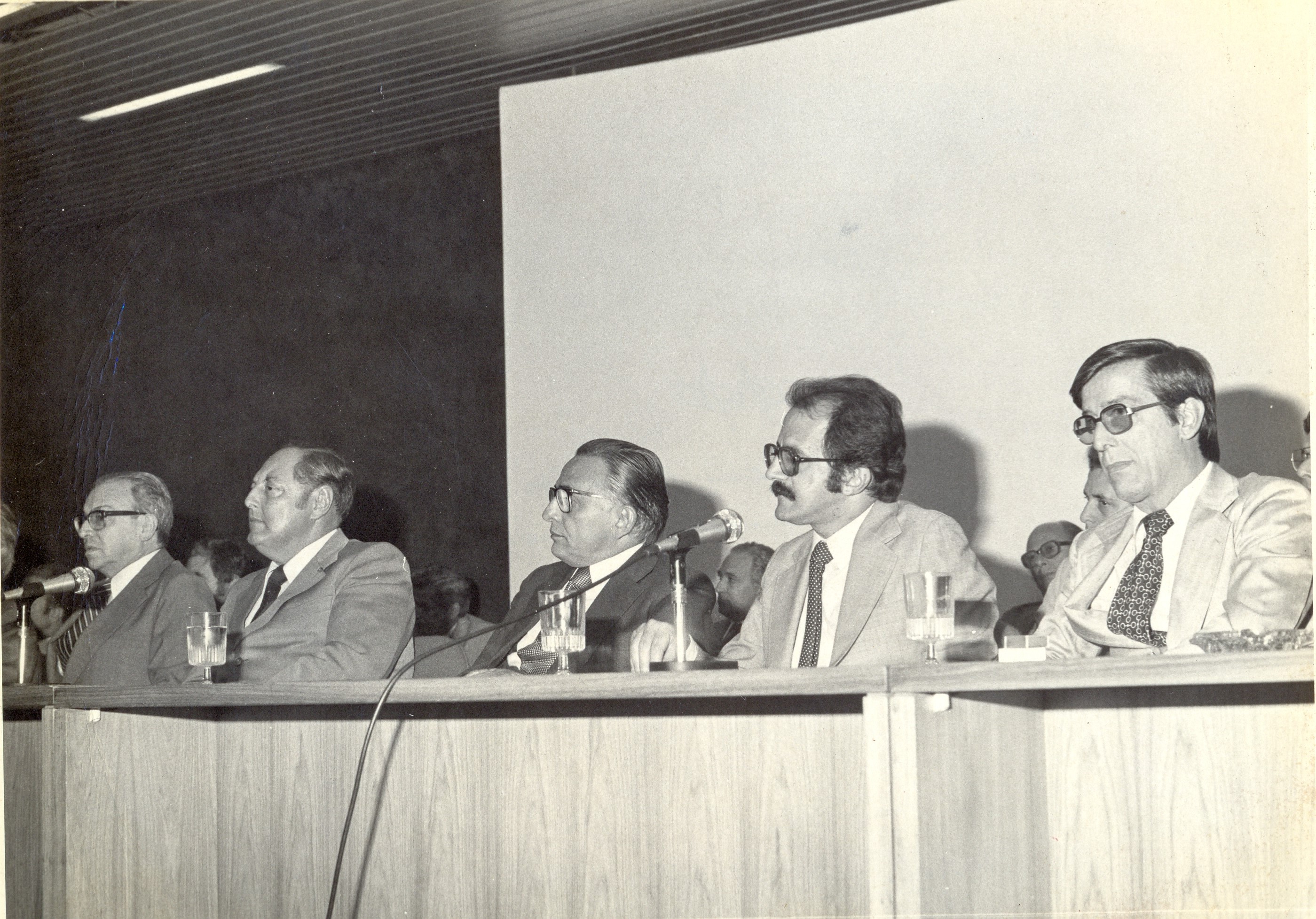 João Camilo de Oliveira Penna, ministro de Minas e Energia; Antônio Aureliano Chaves de Mendonça, vice-presidente da República, Francelino Pereira dos Santos, governador de Minas; Paulo Roberto Haddad, secretário do Planejamento e José Romualdo Cançado Bahia, em reunião não identificada.