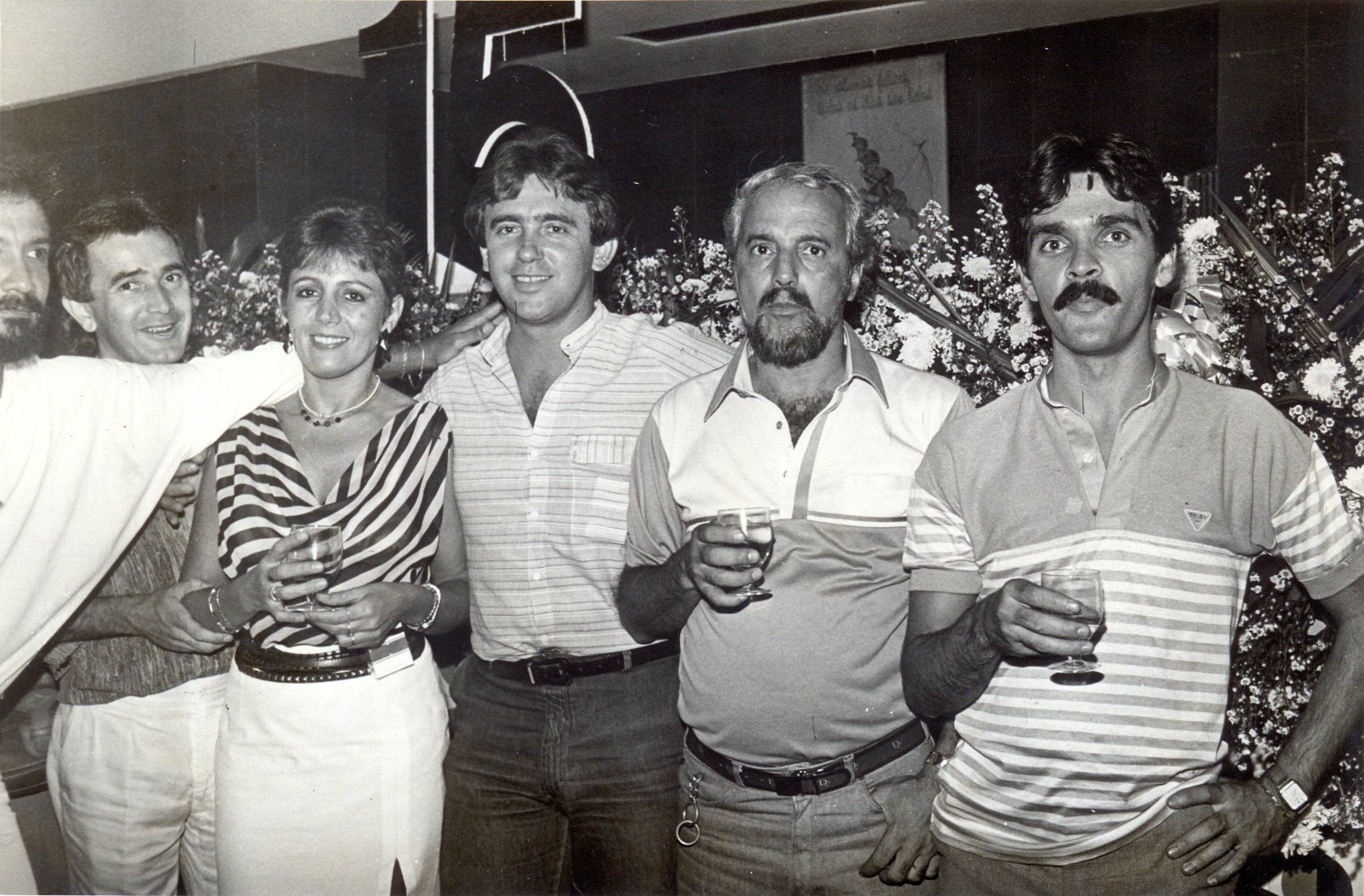 Festa de Natal dos funcionários da Fundação João Pinheiro (FJP), realizada no Centro de Desenvolvimento em Administração (CDA). Vê-se a partir da esquerda Antônio Eustáquio Vitório Marques dos Santos, Regina Maria Marques da Silva, Rogério César Franco Matos, Plínio Carneiro e Sérgio Romário Silveira Couto.