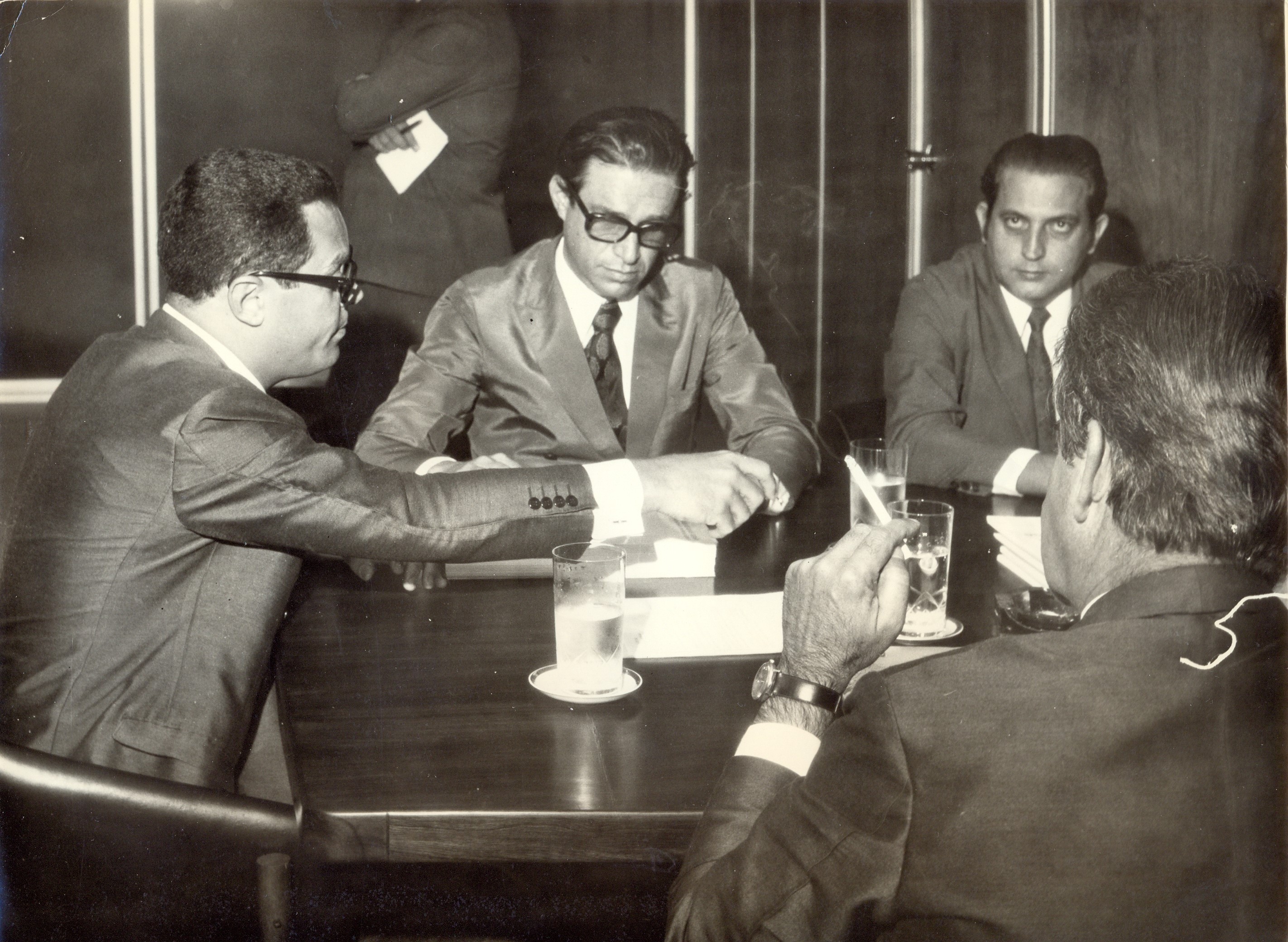 Hindemburgo Chateaubriand Pereira Diniz, presidente da Fundação João Pinheiro (FJP); Silviano Cançado de Azevedo e Marneu Ferreira Starling, por ocasião da reunião na sede da Fundação João Pinheiro (FJP), com técnicos do Banco de Desenvolvimento de Minas Gerais (BDMG), para apresentação dos trabalhos encomendados pelo BDMG à FJP.