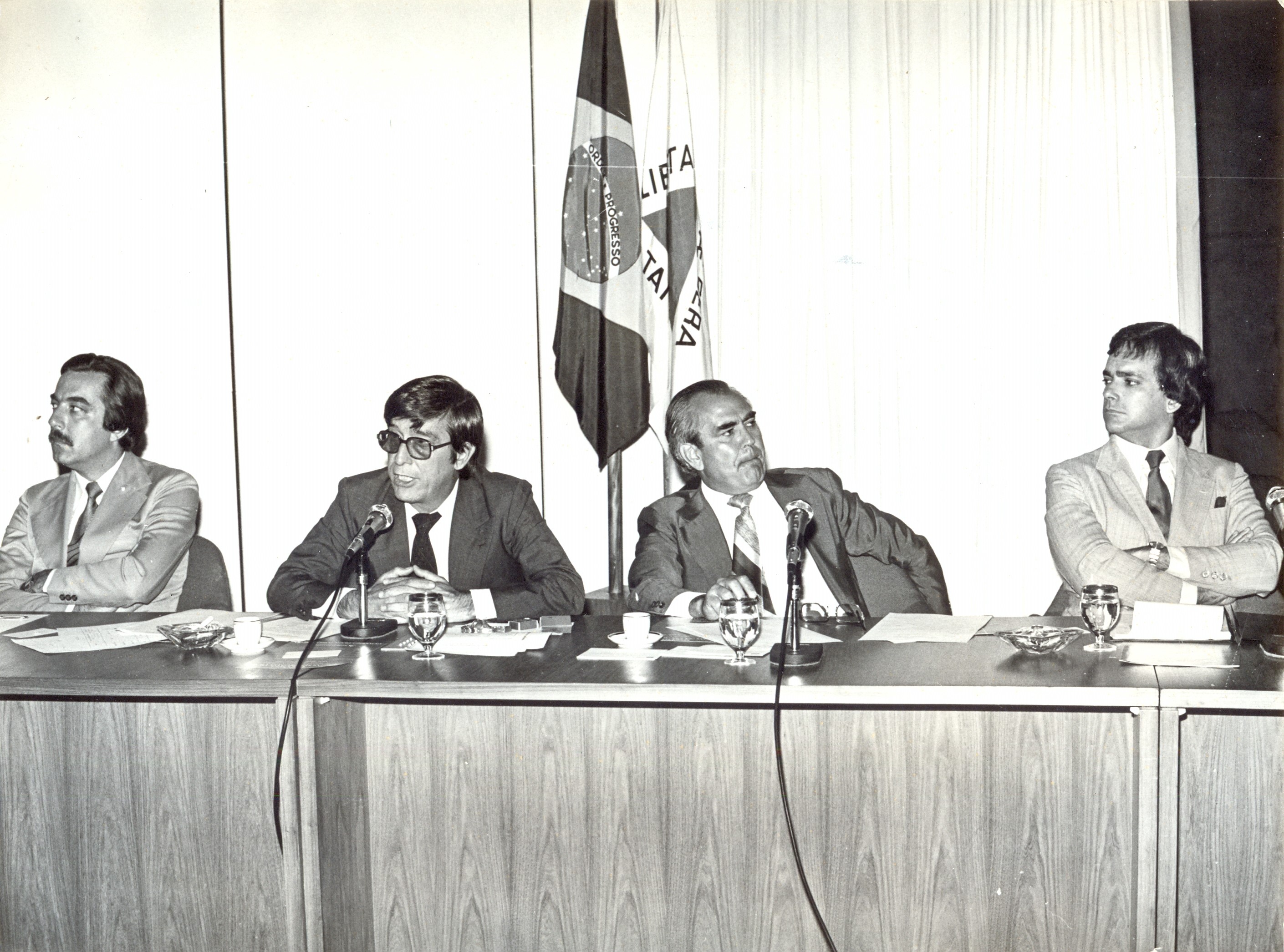 Simpósio "Minas Gerais década de 80", promovido pela Fundação João Pinheiro, na comemoração do seu 10° aniversário, no auditório do Banco de Desenvolvimento de Minas Gerais (BDMG). Vê-se o presidente do Banco de Desenvolvimento de Minas Gerais (BDMG), Luiz Aníbal de Lima Fernandes; secretário da indústria, comércio e turismo, José Romualdo Cançado Bahia; o vice-governador, João Marques de Vasconcelos e o presidente da Fundação João Pinheiro (FJP), Antônio Octávio Cintra.