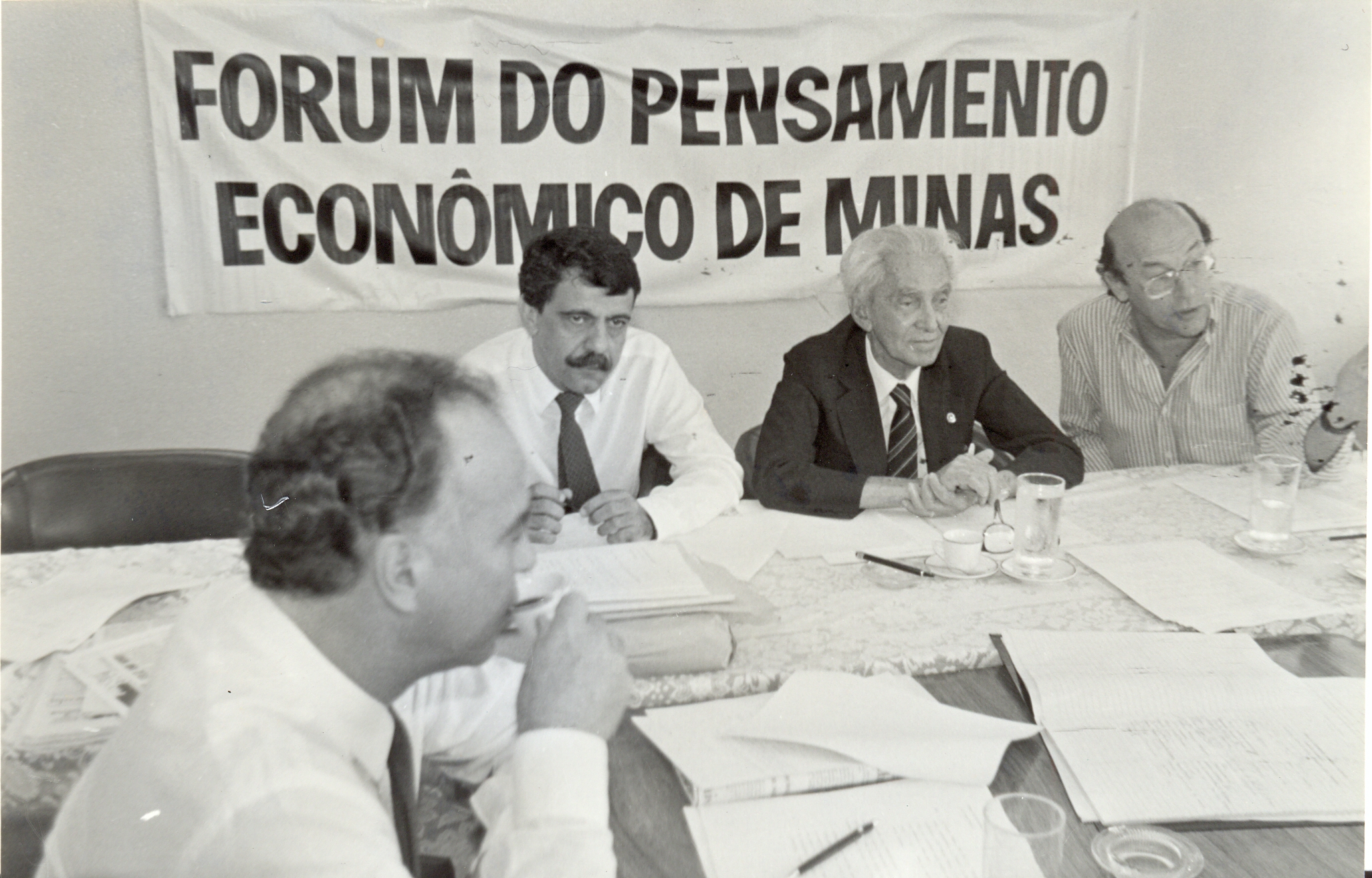 Primeira reunião do “Forum do Pensamento Econômico de Minas Gerais”, criado a 5 de setembro de 1990, com o objetivo de promover debate e formular estratégia para o desenvolvimento de Minas Gerais. Dele participaram várias instituições e entre elas, a Fundação João Pinheiro (FJP). Vê-se os participantes: técnicos e empresários.