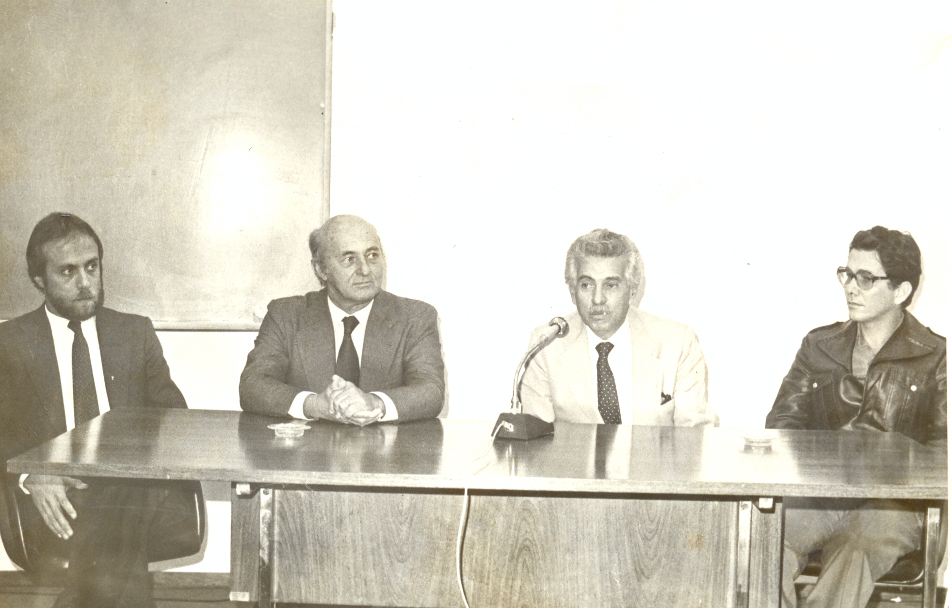 Visita dos alunos do curso de Aperfeiçoamento de Oficiais da Polícia Militar de Minas Gerais ao Centro de Desenvolvimento em Administração (CDA). Vê-se: Fernando Oliveira de Sá Andrade, José Ernesto Ballstaed, diretor do CDA; Aluísio Pimenta, presidente da Fundação João Pinheiro (FJP) e o Major Euro Magalhães.