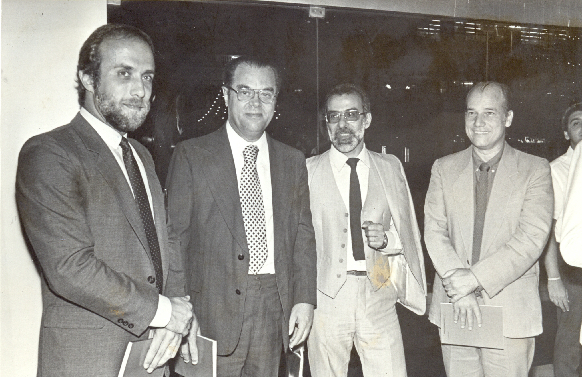 Lançamento do livro "Pela valorização da inteligência", de José Dion de Melo Teles, presidente do Serviço Federal de Processamento de Dados (SERPRO). Vê-se Fernando Oliveira de Sá Andrade, Hindemburgo Chateaubriand Pereira Diniz, presidente da Fundação João Pinheiro (FJP); Carlos Eduardo Côdo Aroeira e Heleno Antônio Pessoa.
