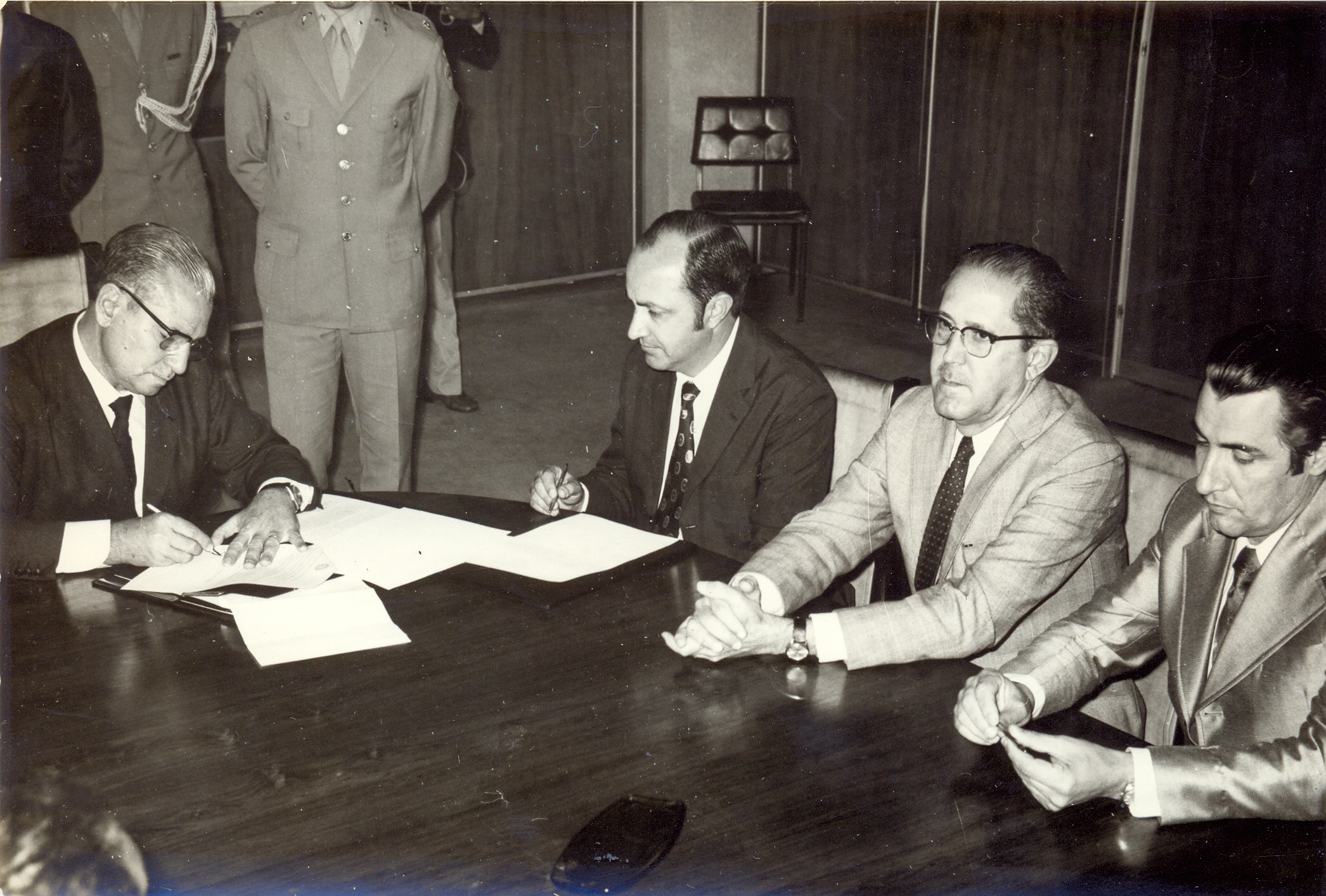 O governador Rondon Pacheco assinando, no Palácio dos despachos o convênio entre a Fundação João Pinheiro (FJP) e a Secretaria de Viação, para assegurar assistência ao Planejamento da Região Metropolitana de Belo Horizonte (PLAMBEL), na implantação da "Grande BH". Vê-se o governador; o secretário de Viação Ildeu Duarte Filho; o secretário do Planejamento, Paulo José de Lima Vieira e o presidente da Fundação João Pinheiro Luis de Oliveira Castro.