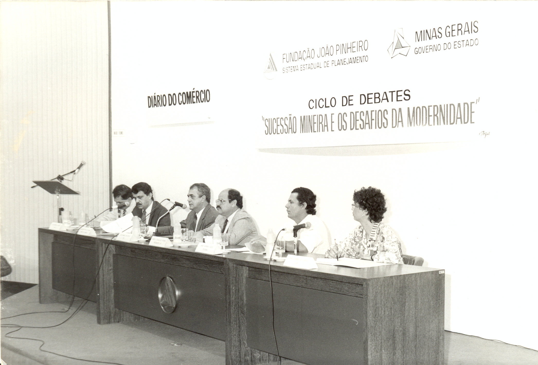 Ciclo de debates “Sucessão Mineira e os Desafios da Modernidade” promovido pela Fundação João Pinheiro (FJP), com o apoio do Diário do Comércio e da TV Minas. Contou com a participação dos candidatos ao governo de Minas Gerais, que expuseram suas propostas e metas para o Estado. Vê-se a partir da esquerda: Juraci Moreira Solto, secretário da Federação dos Trabalhadores na Agricultura do Estado de Minas Gerais (FETAEMG); Deusdedith Righi de Aquino, jornalista do Diário do Comércio; Luiz Manoel da Costa Filho, candidato ao governo de Minas Gerais; Roberto Gonçalves Pereira, presidente da FJP; Luiz Eduardo de Melo Gomes, presidente do Conselho Regional de Administração e Joana Domingues Vargas, da FJP.