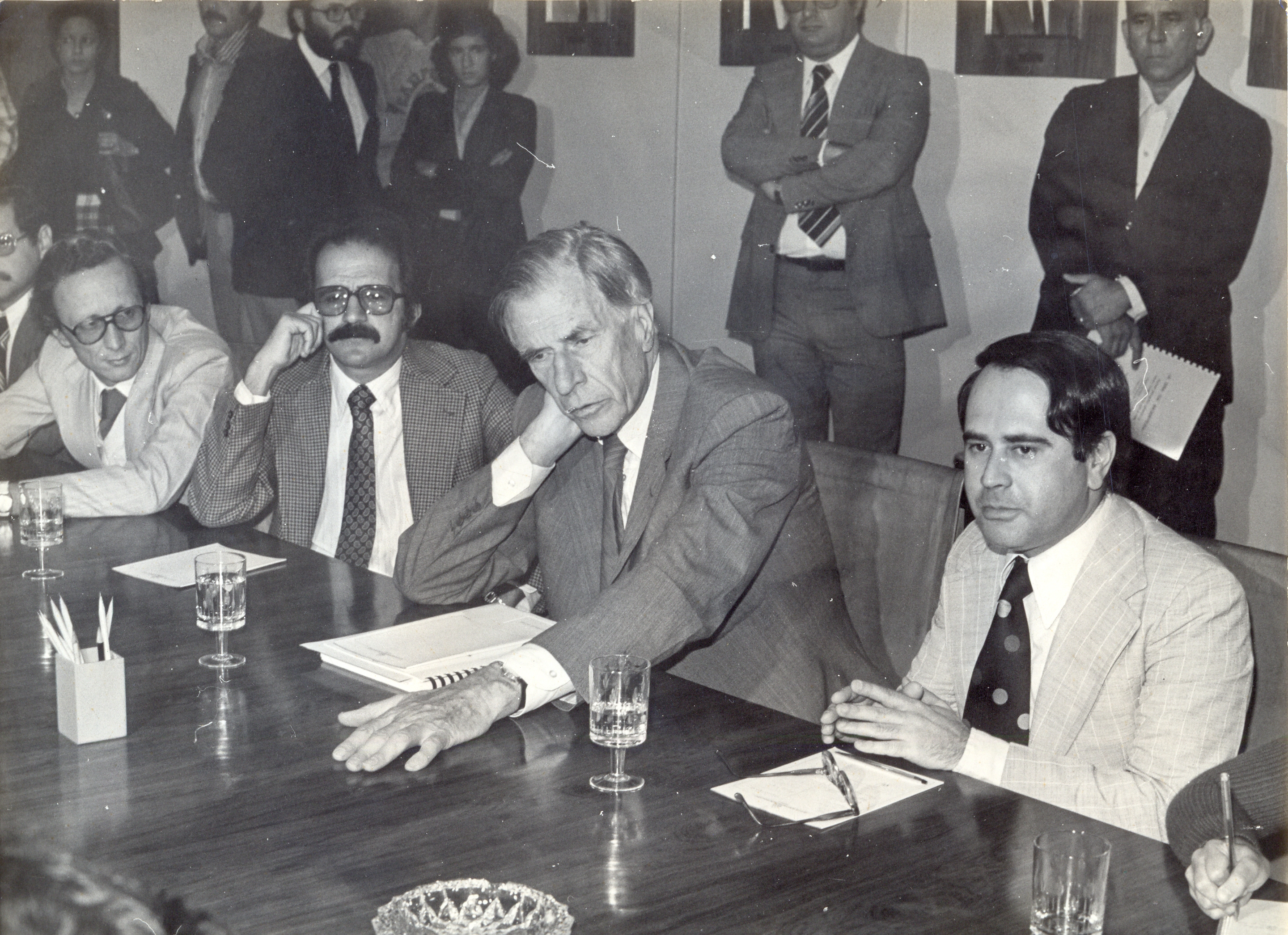 Entrevista coletiva, no Banco de Desenvolvimento de Minas Gerais (BDMG), concedida por John Kenneth Galbraith, autor de "A era da incerteza". Vê-se Olavo Celso Romano, Paulo Roberto Haddad, John Kenneth Galbraith e José Carlos Costa de Oliveira.