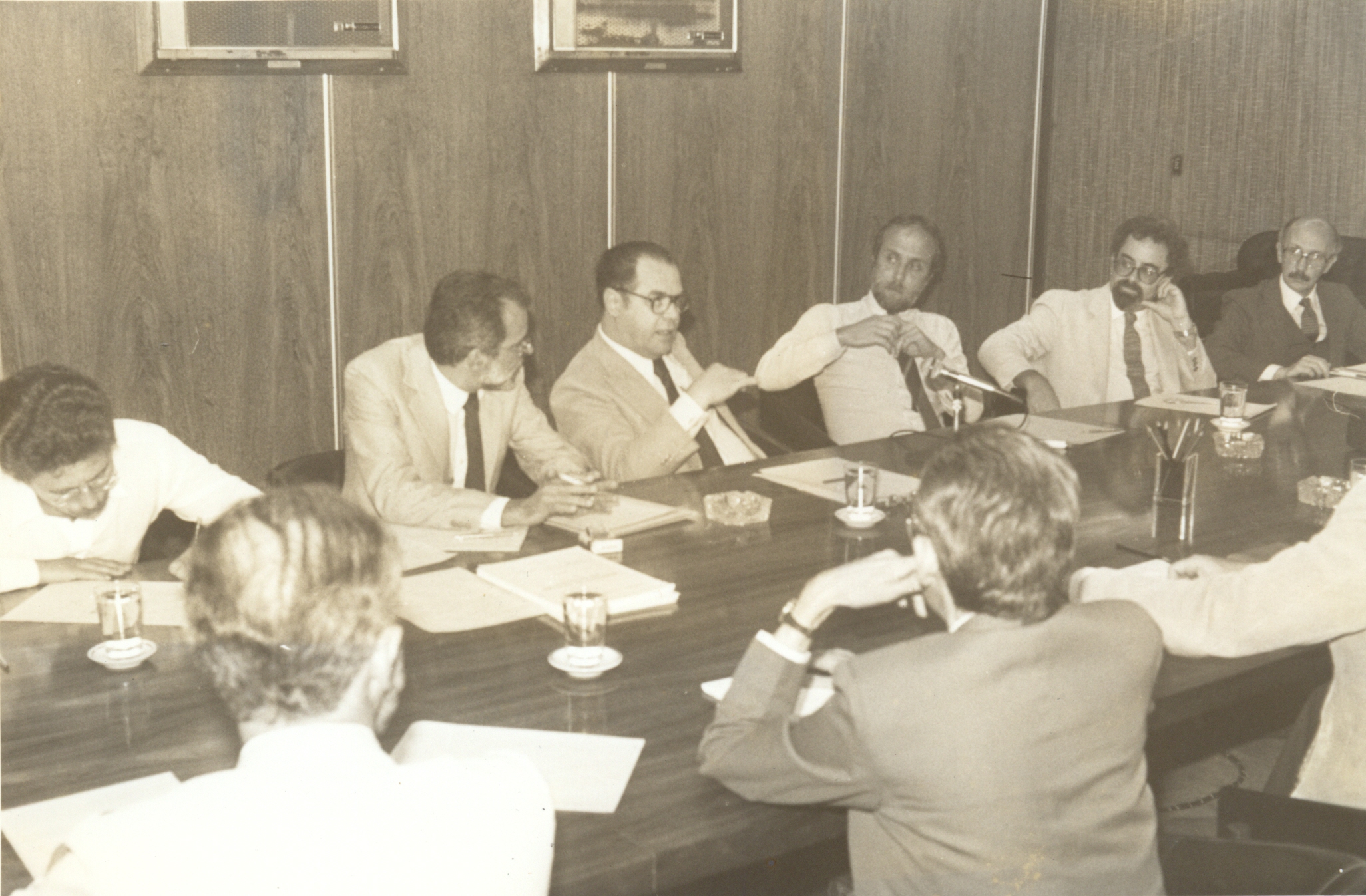 Reunião da Diretoria e técnicos da Fundação João Pinheiro (FJP), com técnicos do Ministério da Irrigação, na FJP. Vê-se a partir da esquerda: José Afonso Bicalho Beltrão da Silva, Carlos Eduardo Côdo Aroeira, Hindenburgo Chateaubriand Pereira Diniz, Fernando Oliveira de Sá Andrade, Teodoro Alves Lamounier e José Maria Fernando Medina.