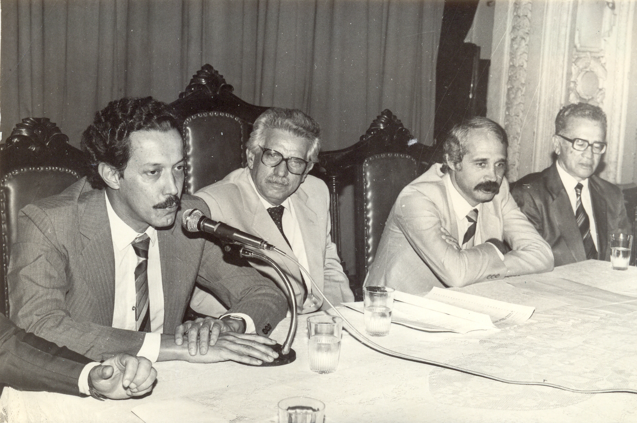 I Encontro Mineiro de Recursos Humanos, de 23 a 25 de maio, promovido pelas Secretarias de Administração, Fazenda, Educação, Planejamento e Fundação João Pinheiro (FJP). Sessão de enceramento no Instituto de Educação de Minas Gerais (IEMG), vendo-se a partir da esquerda: Ivan Barbosa, secretário da Educação; Aluísio Pimenta, presidente da FJP, e Luiz Octávio Mota Valadares, secretário de Administração.