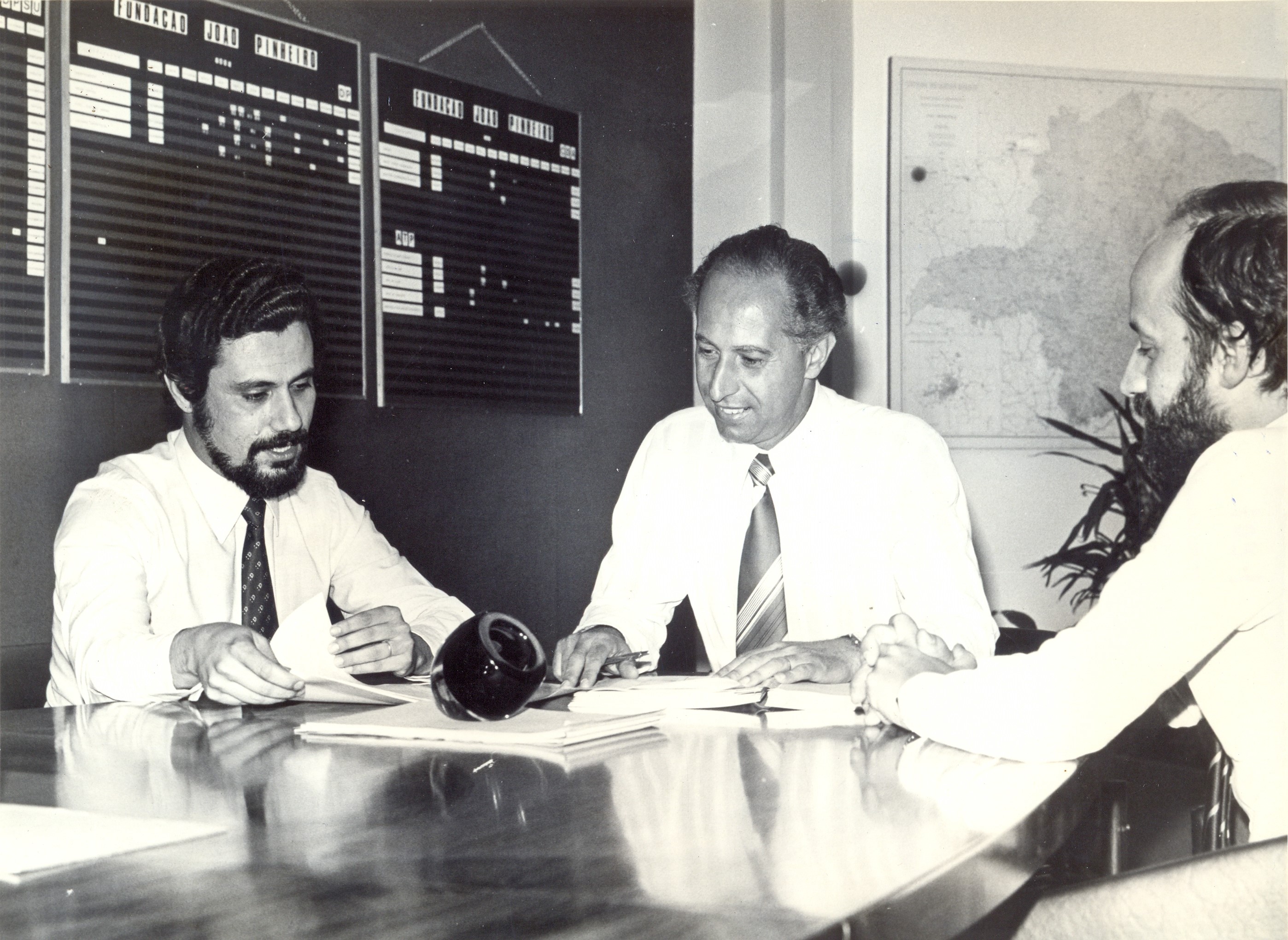 Reunião entre o presidente da Fundação João Pinheiro, Carlos Maurício de Carvalho Ferreira e o diretor do Centro de Desenvolvimento em Administração da Fundação João Pinheiro (FJP), Luiz Cláudio Junqueira Henrique e o coordenador da Assessoria de Planejamento e Controle de Projetos (APCP), Alexandre Carlos Dumont.