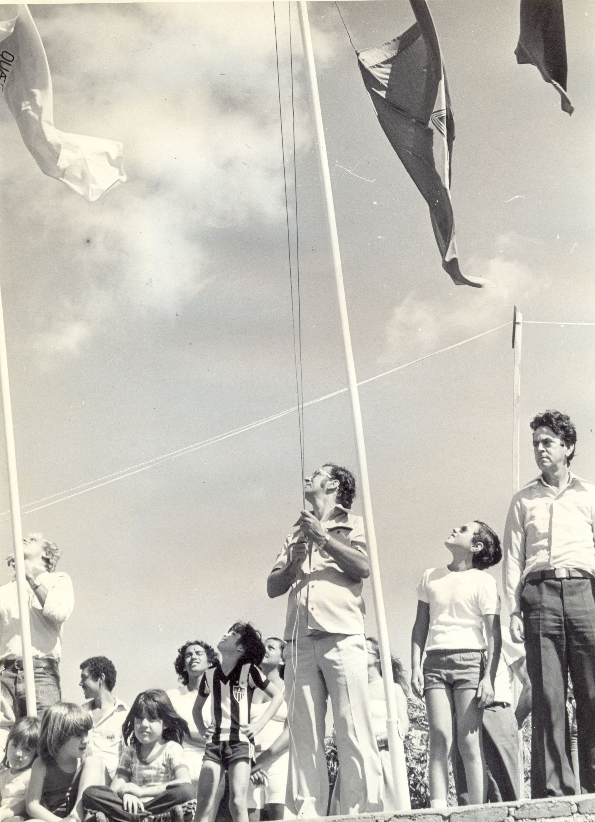 Alnir Marco Schreiber, hasteando a Bandeira, na inauguração do campo de futebol da Associação dos Empregados (AE) da Fundação João Pinheiro (FJP).