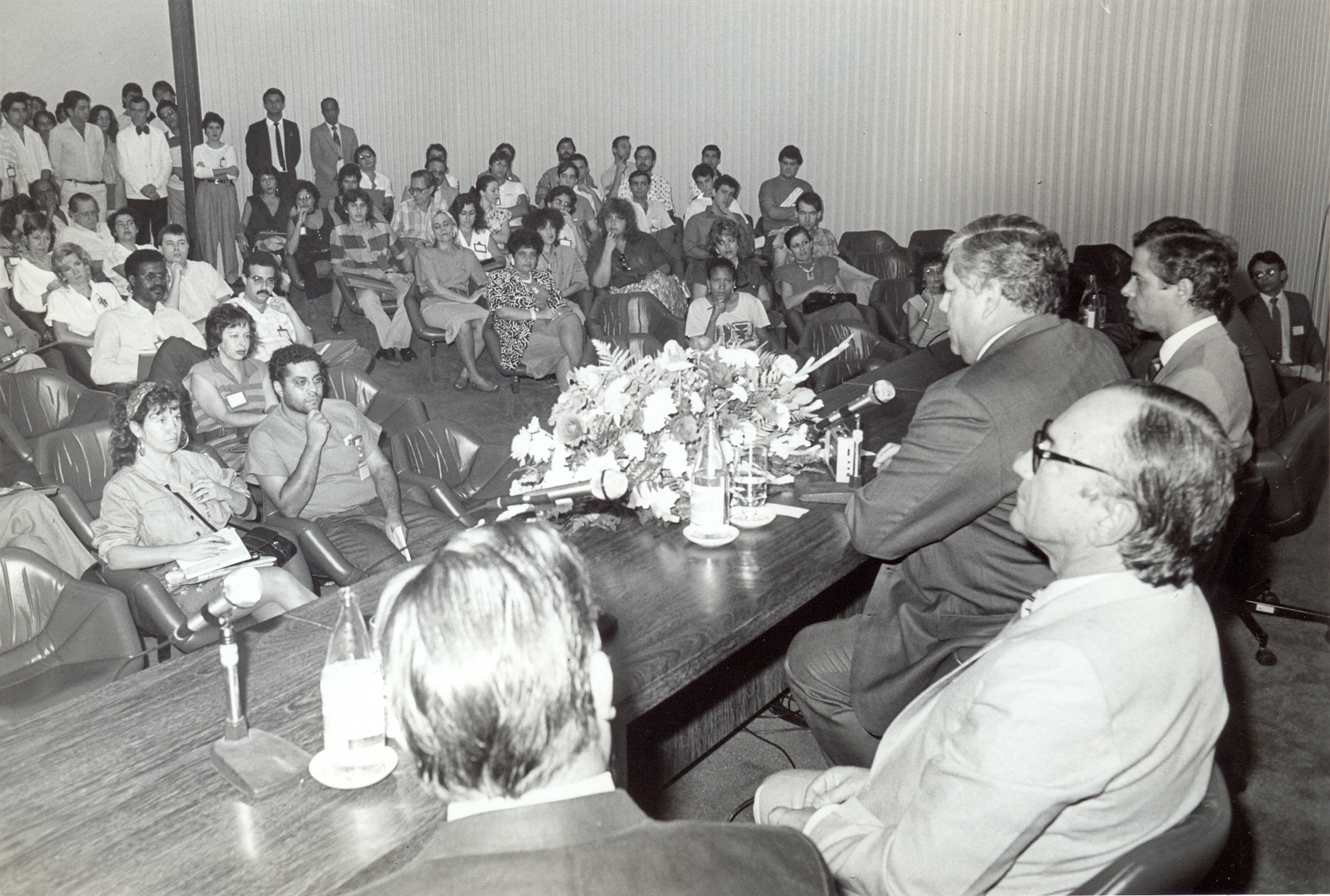 Seminário “Microeletrônica e Sociedade: impactos de tecnologias emergentes”, promovido pela Fundação João Pinheiro (FJP), com o apoio da Financiadora de Estudos e Projetos (FINEP) e da Fundação de Amparo à Pesquisa de Estado de Minas Gerais (FAPEMIG). Vê-se a partir da esquerda: à mesa, Hamilton Parma, presidente da FJP; Newton Cardoso, governador do Estado de Minas Gerais; José Ivo Gomes de Oliveira, secretario de Estado de Ciência e Tecnologia, e parte da plateia.