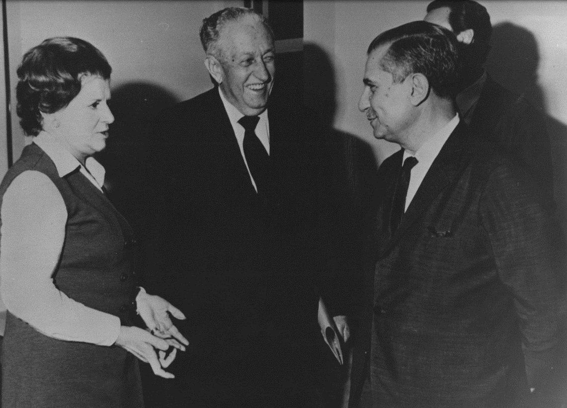Evento de instalação da Fundação João Pinheiro. Vê-se, da esquerda para a direita, o casal Coracy Uchôa Pinheiro e Israel Pinheiro, então governador de Minas Gerais, e Rondon Pacheco.