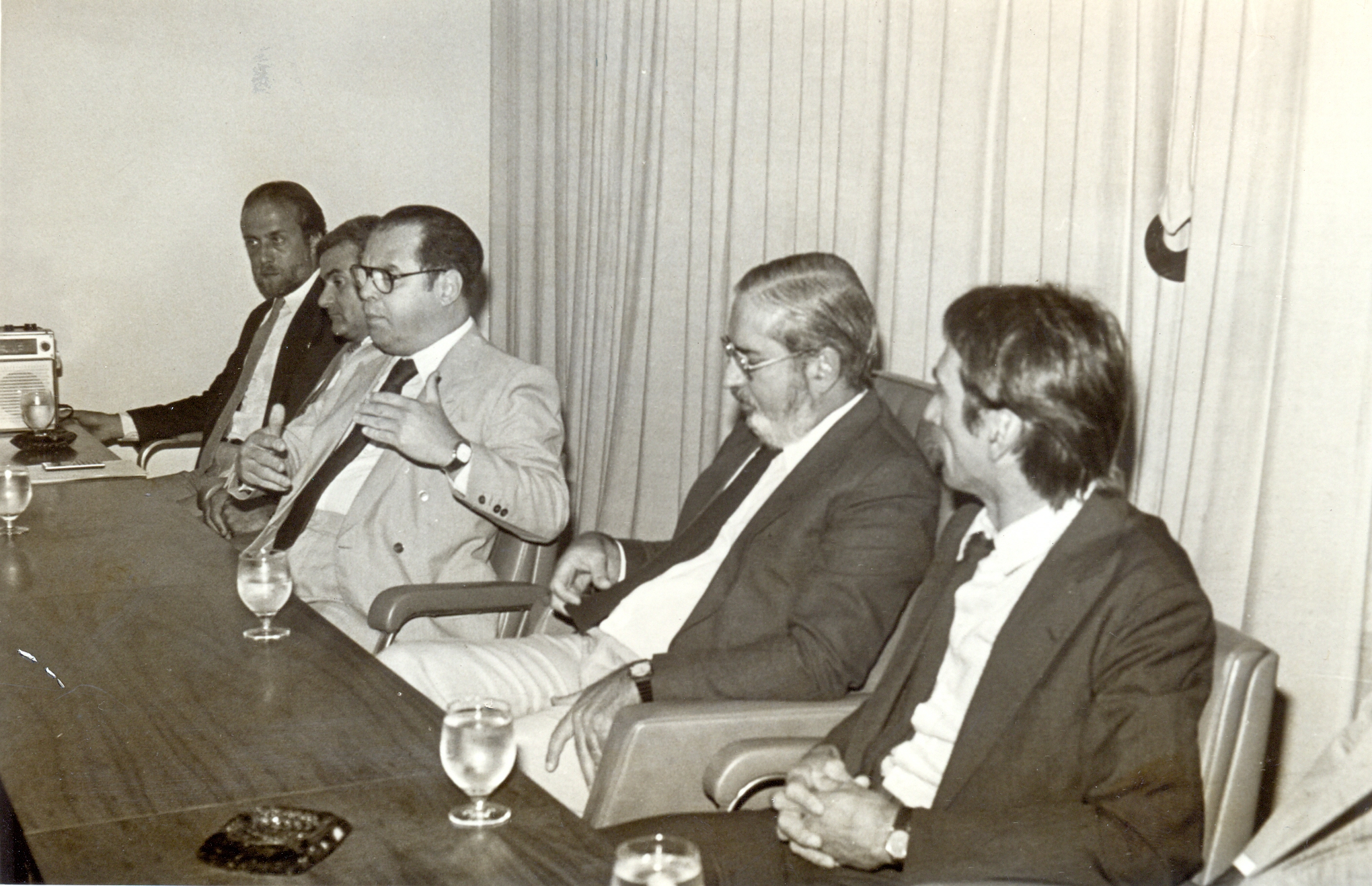 Assinatura de convênio entre a Fundação João Pinheiro (FJP) e a Companhia de Saneamento de Minas Gerais (Copasa), para elaboração do projeto "Avaliação e Desenvolvimento do Sistema de Planejamento da Copasa". Vê-se a partir da esquerda: Fernando Oliveira Sá Andrade; Vicente de Paula Mendes; Hindemburgo Chateaubriand Pereira Diniz, presidente da FJP; Marco Antônio Guimarães Monteiro e Rui Soares Leal, diretor financeiro da Copasa.