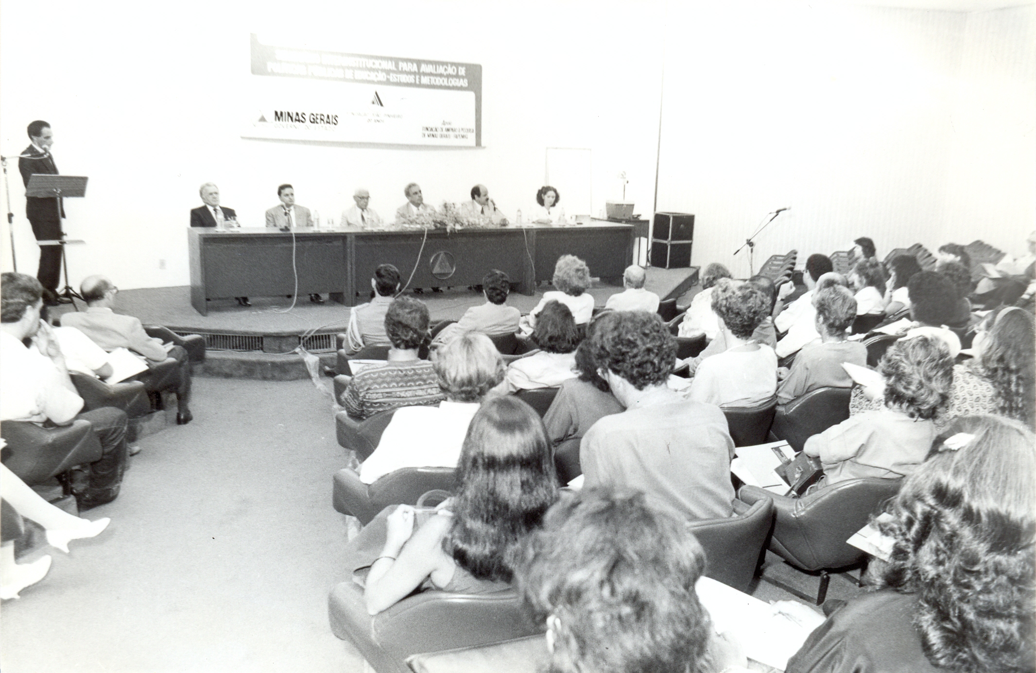 Abertura do “Seminário Interinstitucional para Avaliação de Politicas Publicas de Educação – Estudos e Metodologia” promovido pela Fundação João Pinheiro (FJP) com apoio da Fundação de Amparo à Pesquisa do Estado de Minas Gerais (FAPEMIG). Vê-se os componentes da mesa e parte da plateia.