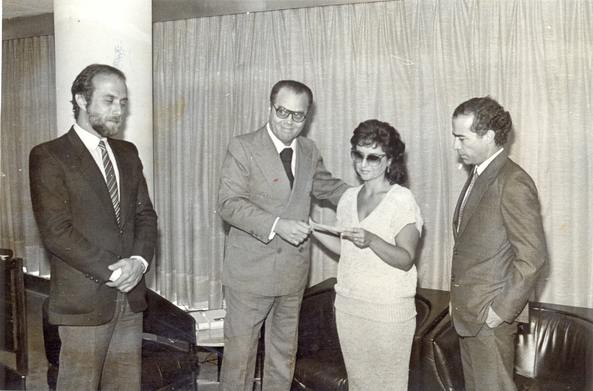 Hindemburgo Chateaubriand Pereira Diniz, presidente da Fundação João Pinheiro (FJP), entrega à Miriam Carneiro, viúva do funcionário Plínio Carneiro, pecúlio, pago pela Fundação de Seguridade Social de Minas Gerais (FUNDASEMG). Vê-se à esquerda Fernando Oliveira de Sá Andrade e o primeiro a direita, o presidente da FUNDASEMG, Paulo Angelo Carvalho de Souza.