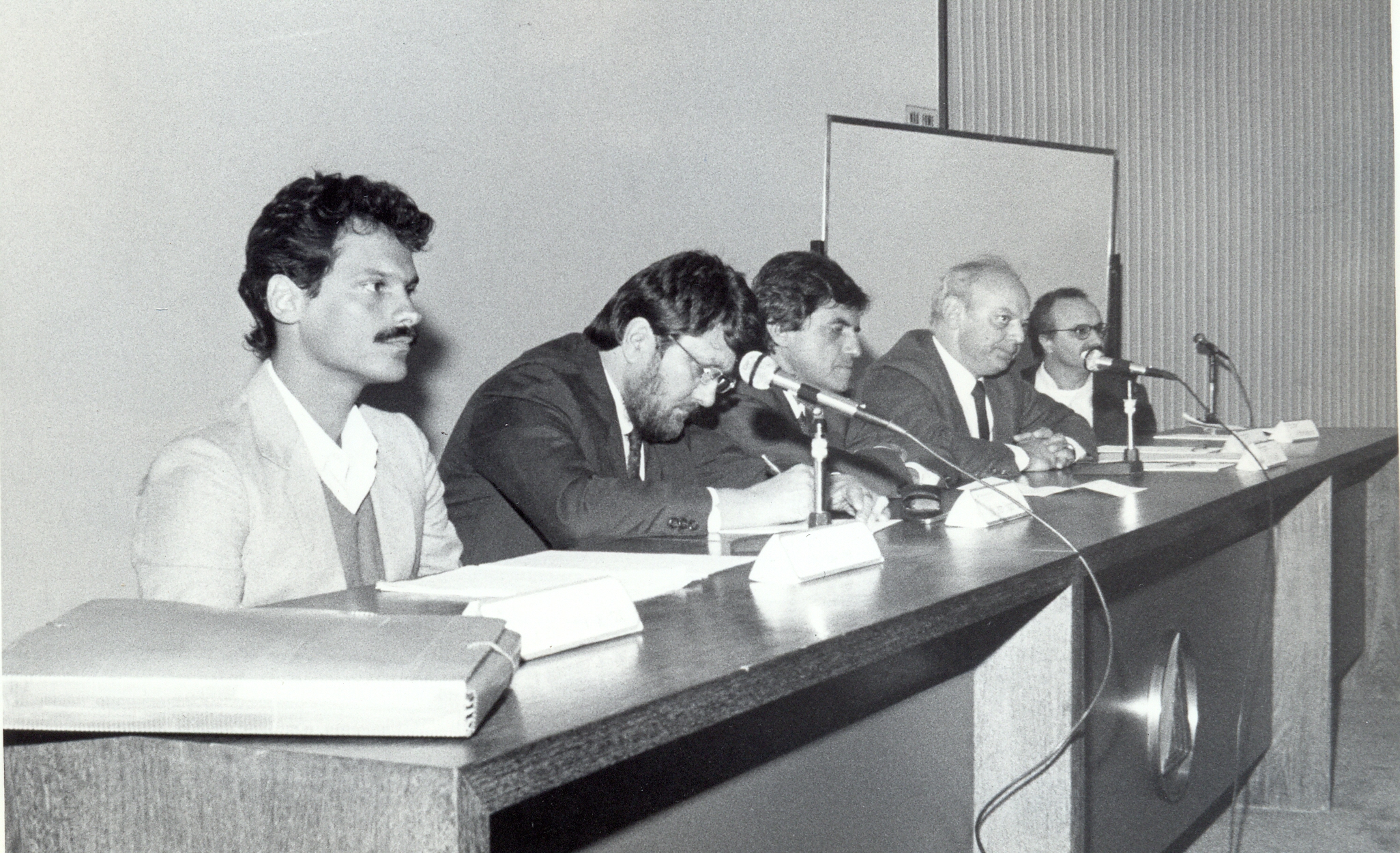 Mesa redonda promovida pela Fundação João Pinheiro (FJP) no auditório da entidade sobre “O papel do estado hoje”. Vê-se a partir da esquerda, Paulo Volker, professoe da UFMG; Stefan Bogdan Salej, presidente do Centro das Industrias das Cidades Industriais (CICI); Antônio Luiz Villaça Mendes, diretor da FJP; Otto Jacob, diretor da FJP e Fábio Wanderley Reis, professor da UFMG.